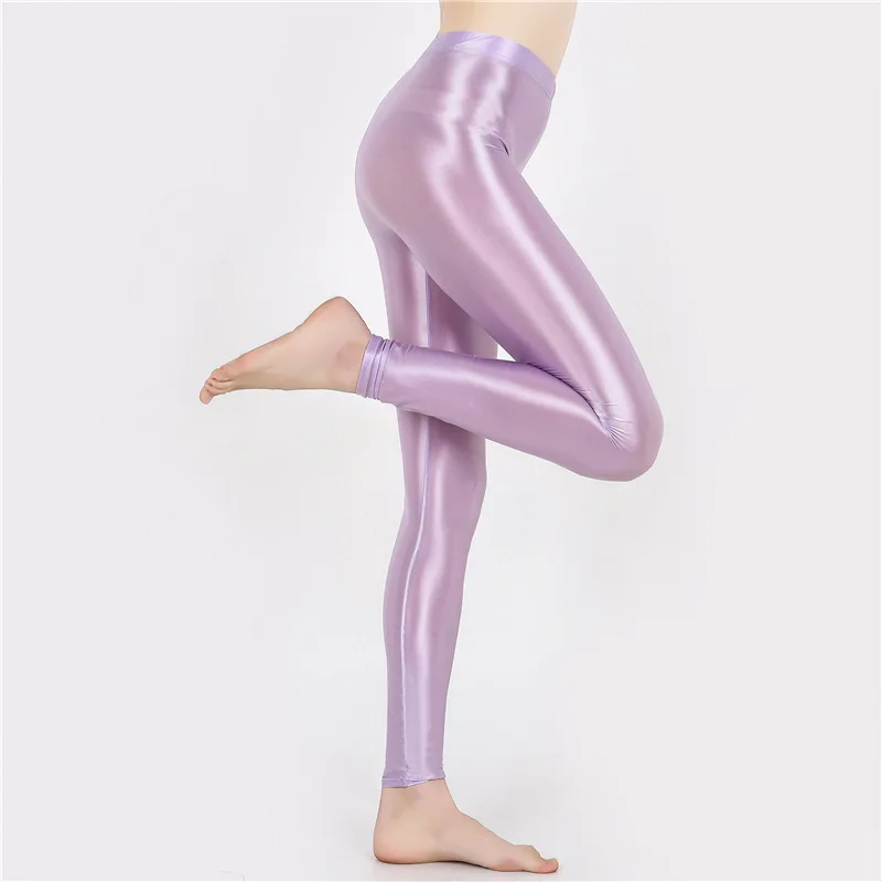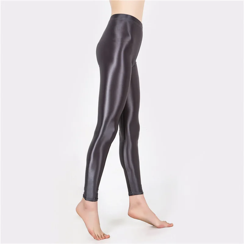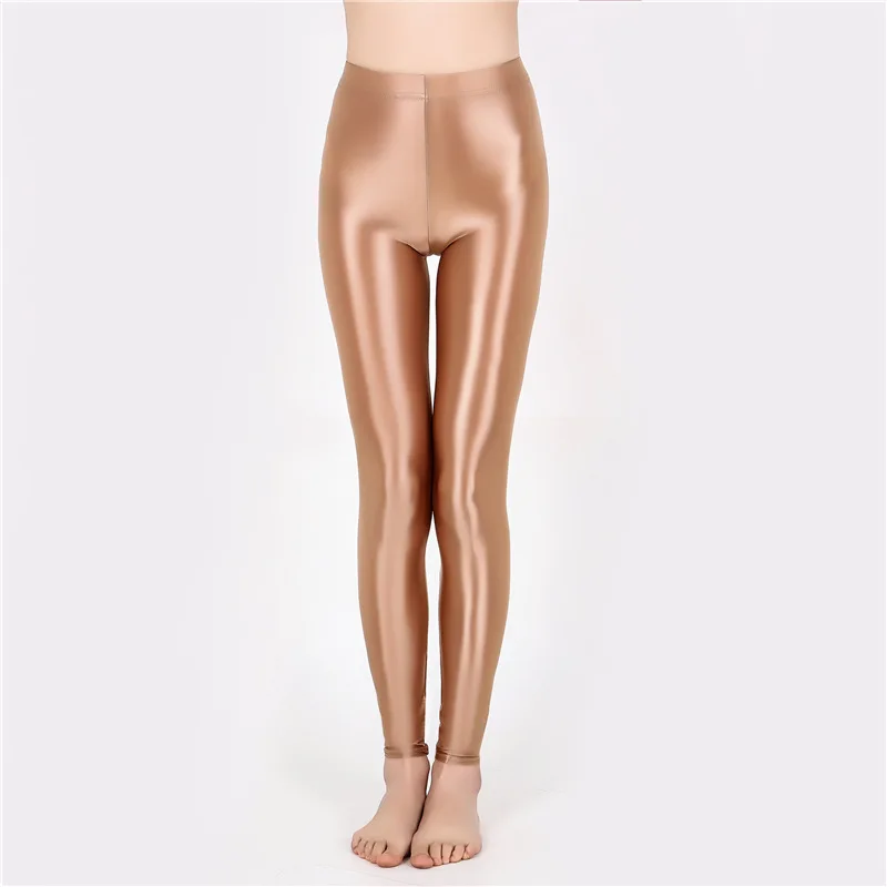 Сексуальные атласные глянцевые леггинсы YGYEEG, блестящие брюки до щиколотки, лидер продаж, Женские однотонные флуоресцентные нейлоновые брюки с эластичным поясом
