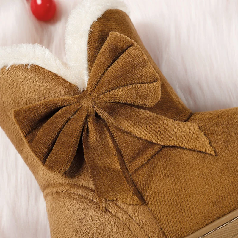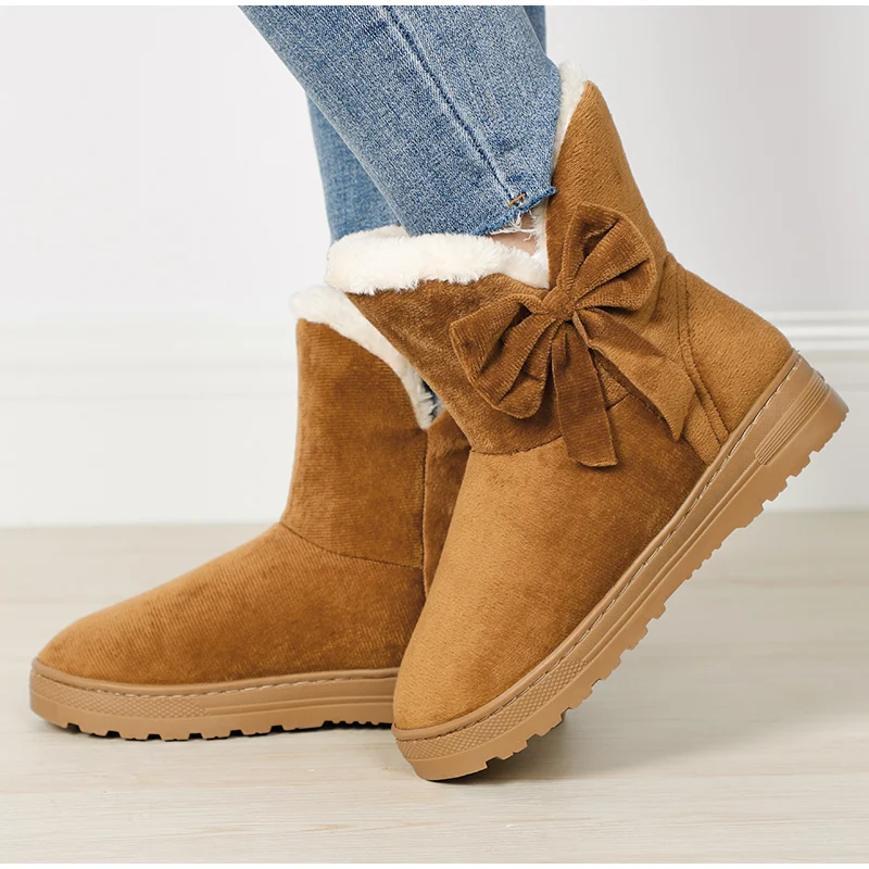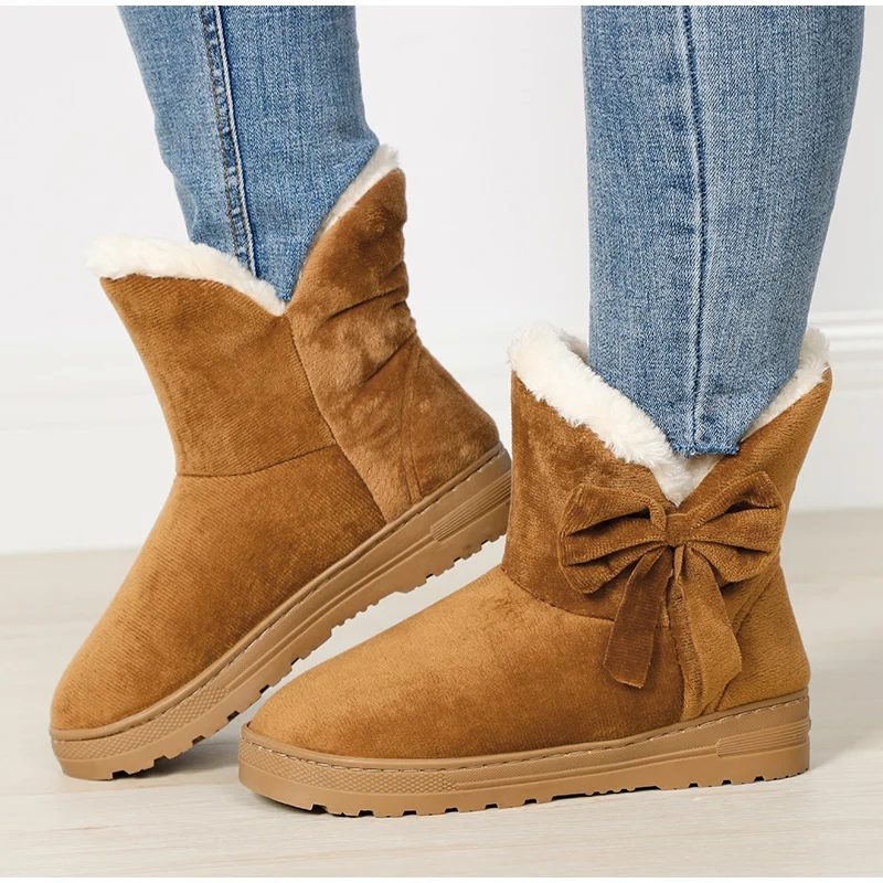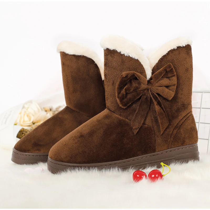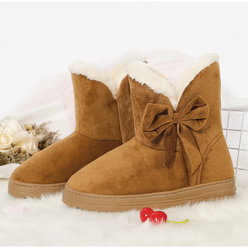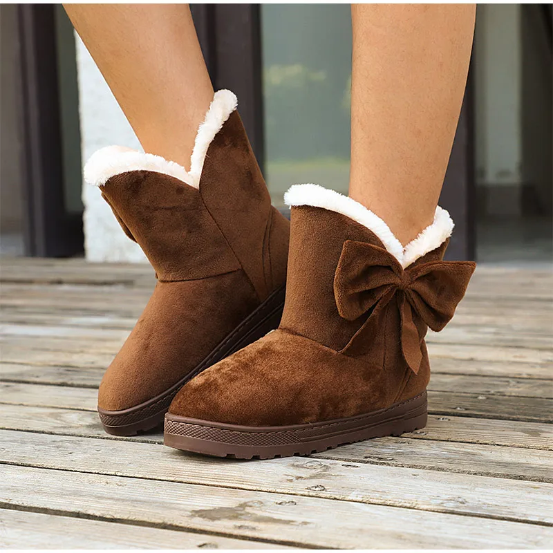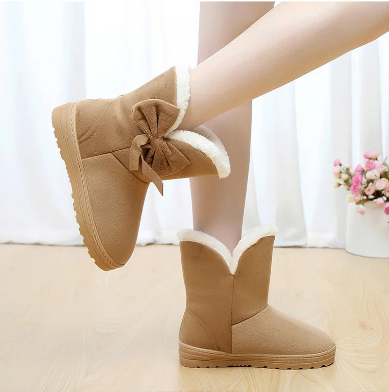 Женские ботинки на меху, зимние, теплые, повседневные, с бантиком, Нескользящие, плюшевые, замшевые, на плоской подошве