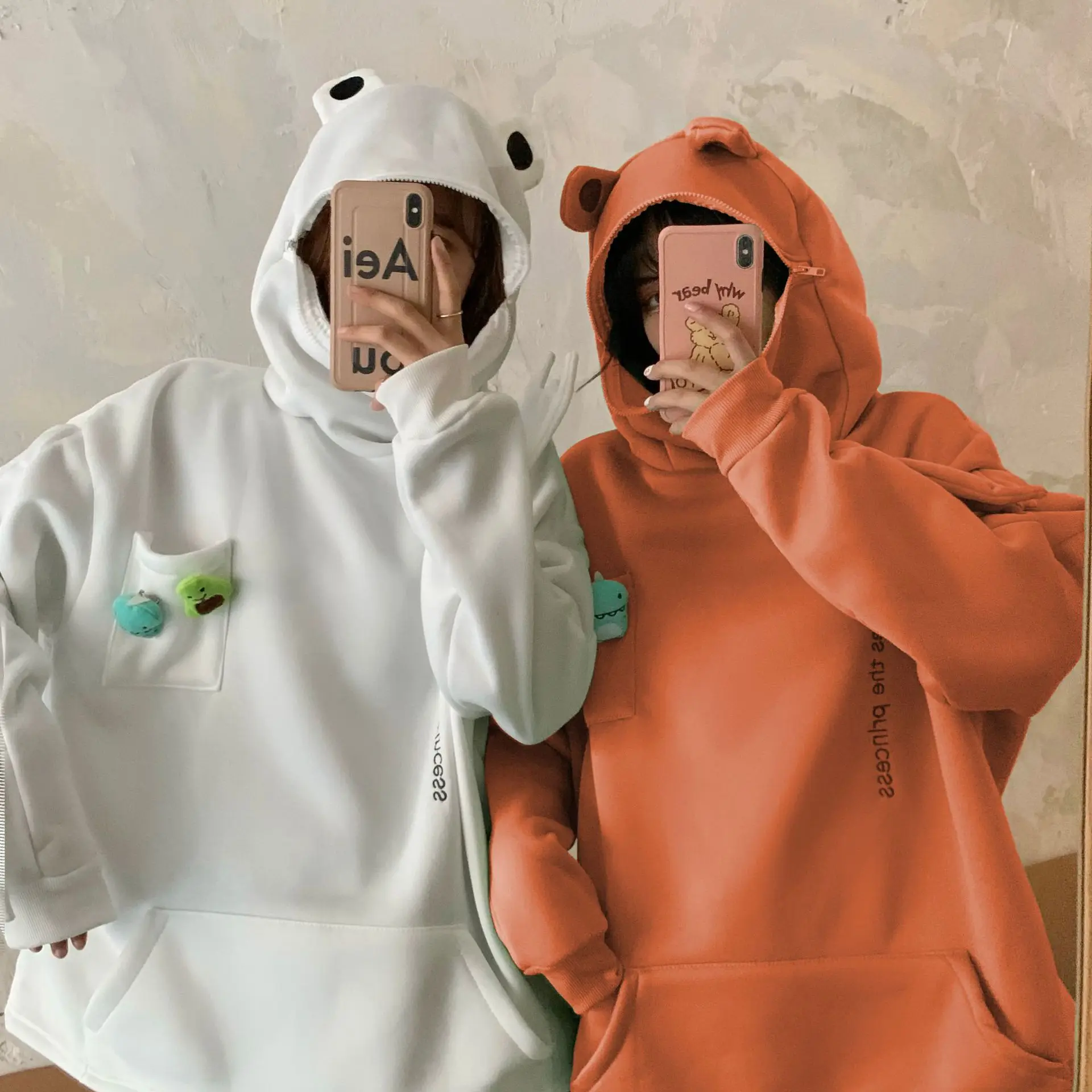 Пуловер в виде лягушки, свитшот большого размера, одежда в Корейском стиле для пар, женские толстовки, мужские толстовки с капюшоном и бархатной молнией