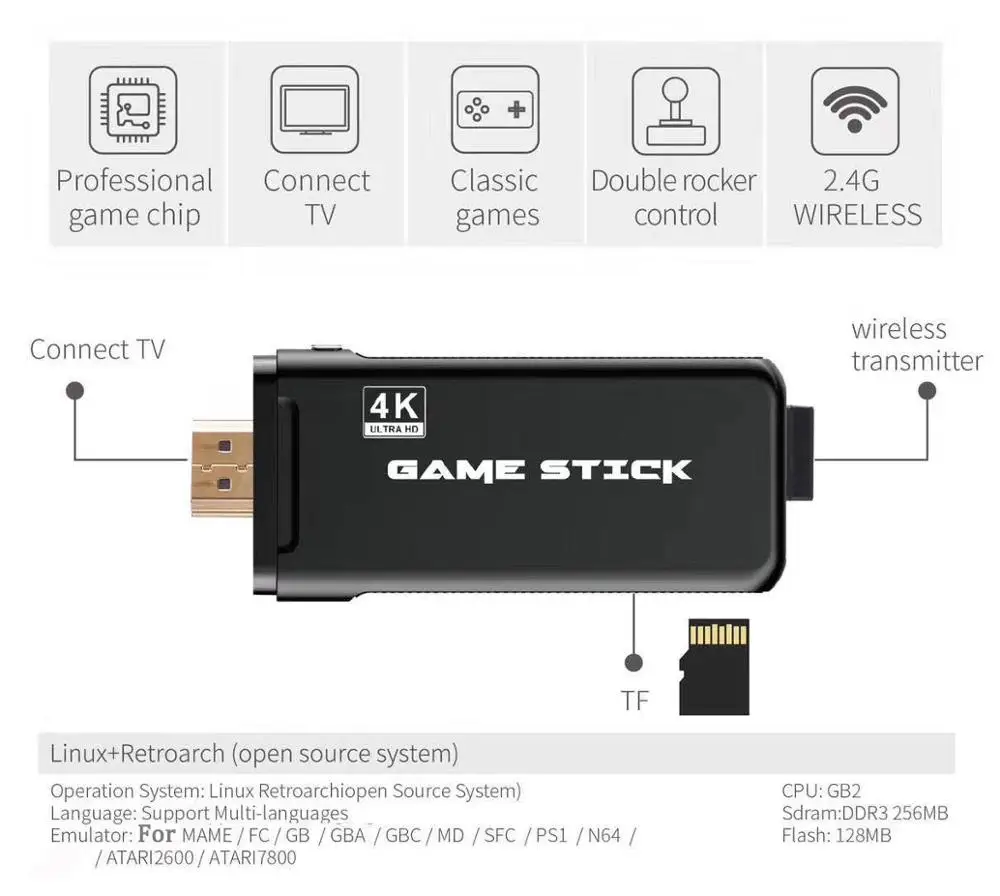 Вы можете скачать игру самостоятельно:1. Список игр, включая CPS/FC/GBA/GB/GBC/MD/SFC/PS1/ATARI simulator games, всего 3500 +/10000 +.2. История игр, список записей игр, сортировка в зависимости от времени игры.3. Вы можете использовать кнопку R2 для сбора или снятия любимых игр.4. Поиск игры, на основе английского полного соответствия или запроса по ключевому слову, китайский запрос первой буквы, соответствующая игра.5. Настройки игры, выбор языков, настройки тона клавиш, просмотр локальных файлов, Восстановление настроек по умолчанию, Системная информация, настройки выхода.Примечание!1. Совершенно новый интерфейс HD выход поддержка десяти эмуляторов, подключение 2 контроллеров, HDMI HD выход ссылка ТВ/монитор/проектор Примечание: карта 32G является стандартным, 3500 + игр, если 10000 + игр нужно 64G.2. Поддержка десяти эмуляторов PS1/ATARI/MAME/SFC/FC/GBA/GB/GBC/MD/CPS.Посылка включает в себя:32G 3500 игр (два проводных контроллера) игровая консоль M8 (кабель HD, шнур питания, руководство)Или64G 10000 игр (два проводных контроллера) игровая консоль M8 (кабель HD, шнур питания, руководство)