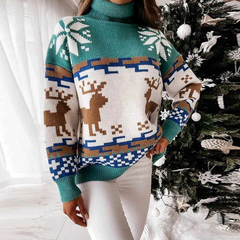 Женский Рождественский свитер, джемпер, модный жаккардовый вязаный свитер со снежинками и оленями, Зимняя Повседневная теплая водолазка, топы, пуловер для женщин