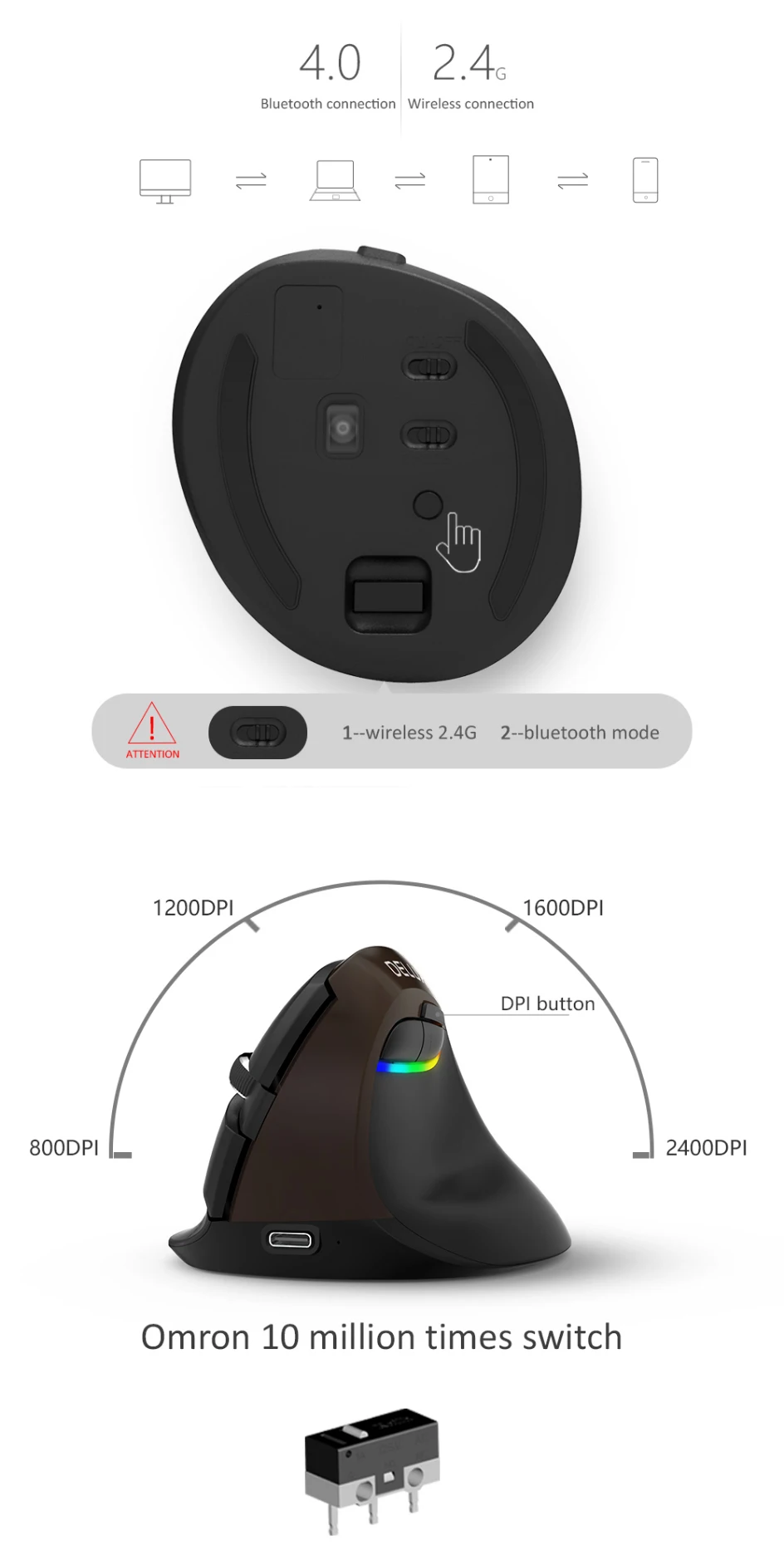 Беспроводная оптическая мышь-6 кнопок-Эргономичный дизайн, мини-размер-DPI: 800/1200/1600/2400-Bluetooth + 2,4 ГГц, легкое переключение между 2 беспроводного режима-Заряжаемая Вертикальная мышь с литий-полимерным аккумулятором, 1000 мАч-1,4 м TPE кабель для зарядки-RGB llight-Для windows 2000/XP/Vista/7/8/10