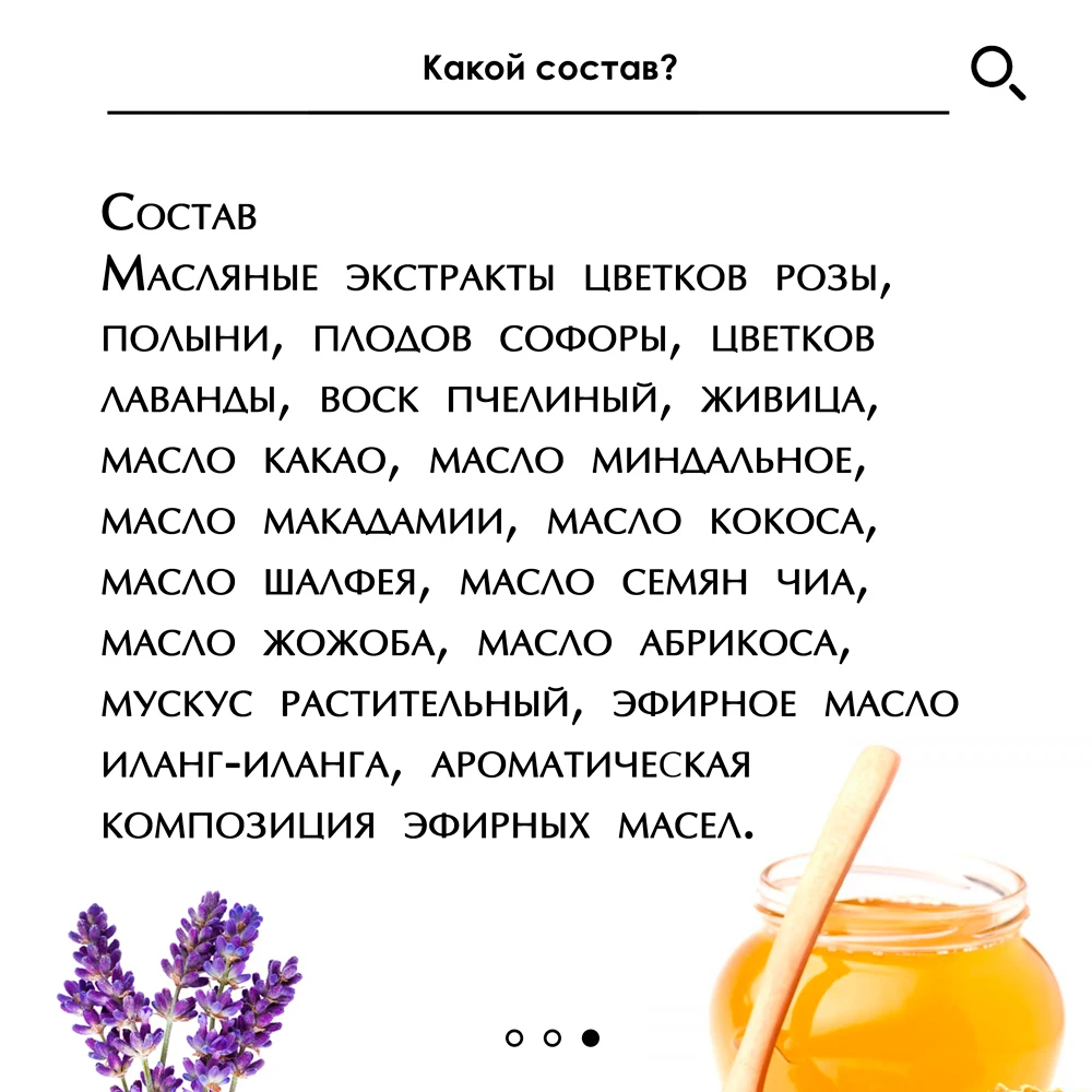 Масляные экстракты цветков розы, полыни, плодов софоры, цветков лаванды, воск пчелиный, живица, масло какао, масло миндальное, масло макадамии, масло кокоса, масло шалфея, масло семян чиа, масло жожоба, масло абрикоса, мускус растительный, эфирное масло иланг-иланга, ароматическая композиция эфирных масел.