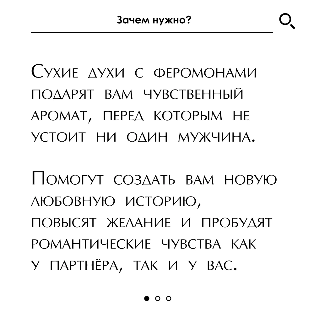 Сухие духи с феромонами подарят вам чувственный аромат, перед которым не устоит ни один мужчина. Помогут создать вам новую любовную историю, повысят желание и пробудят романтические чувства как у партнёра, так и у вас.
