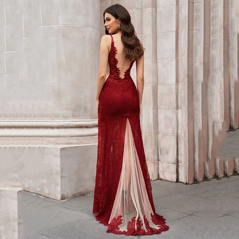 Платье-Русалка Женское бордовое из тюля, без рукавов, с V-образным вырезом