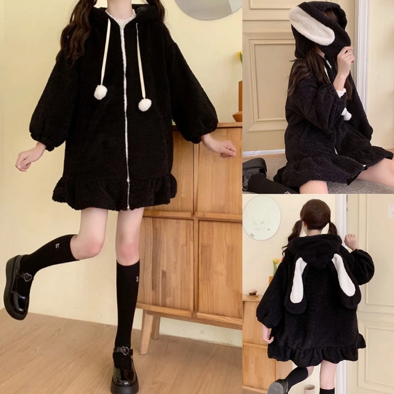 Женская зимняя пушистая куртка 20CF с капюшоном и длинным рукавом в стиле Харадзюку кавайный кардиган с ушками кролика на молнии пальто из искусственного меха плюшевые теплые оборки