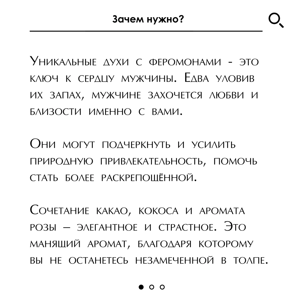 Состав: Масляный экстракт зверобоя, цветков розы, воск пчелиный, бобровая струя (кастореум), масло какао, масло кокосовое, масло авокадо, масло грейпфрутовой косточки, масло манго, масло черного тмина, эфирное масло апельсина, ароматическая композиция эфирных масел.Сухие духи "Нота любви" идеальный спутник для современной женщины! Он заряжает энергией и поднимает настроение, придавая Вам таинственное очарование. Уникальные духи с феромонами - это Ваш ключ к сердцу мужчины. Едва уловив их запах, мужчине захочется любви и близости именно с Вами. Они подчеркнут и усилят Вашу природную привлекательность, помогут вам стать более раскрепощенной. Сочетание ванили, кокоса и аромата сандала, элегантное и страстное. Духи с феромонами – это манящий аромат, благодаря которому вы не останетесь незамеченной в толпе. Способ применения: наносить на чистую кожу запястья, на впадинку на шее и на затылке, зону за ушами, виски, на сгиб локтя, внутреннюю сторону колена, носогубная складка, в ложбинку между грудей.