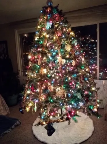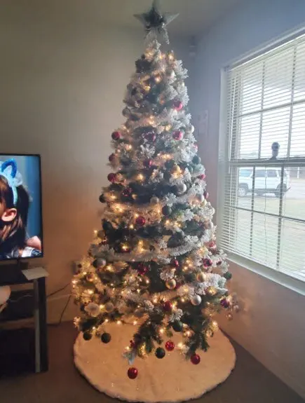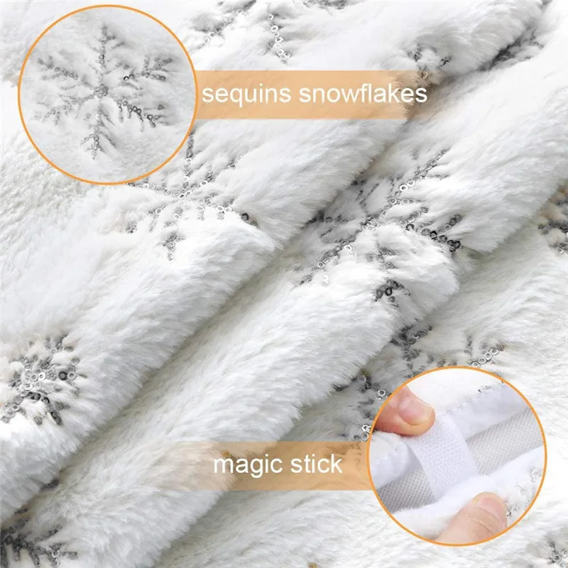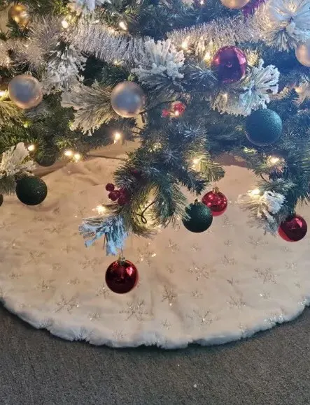 This is a wonderful kick line for any Christmas tree. White, thickness and snowflake decals add sparkle and charm to my Christmas tree. It is now my puppy's favorite new place to curl up and sleep.