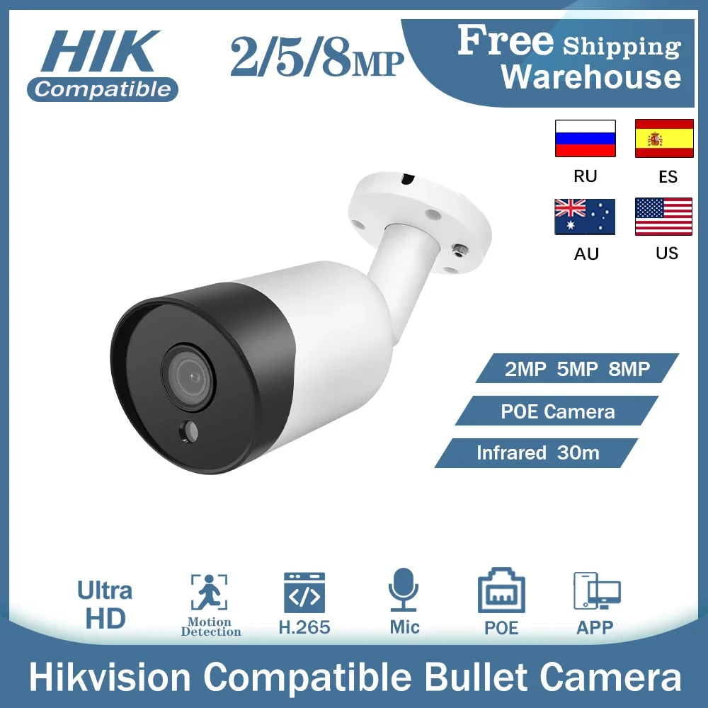 Совместимая IP-камера Hikvision, 1080P, 5 МП, 8 Мп, H.265, POE, встроенный микрофон, ИК, 30 м, цилиндрическая камера видеонаблюдения для дома и улицы