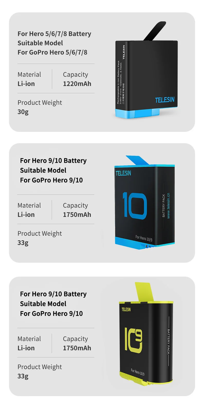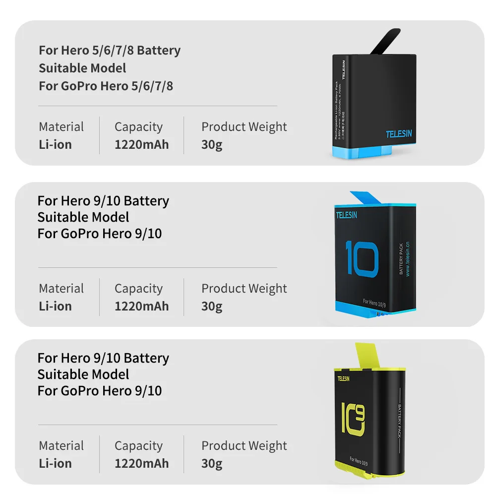 Аккумуляторная батарея TELESIN для GoPro 10 9 8 7 6 5, зарядное устройство с 3-сторонней светодиодной подсветкой, футляр для карт TF и чтения аккумуляторов для GoPro Hero 5 6 7 8 9, черный