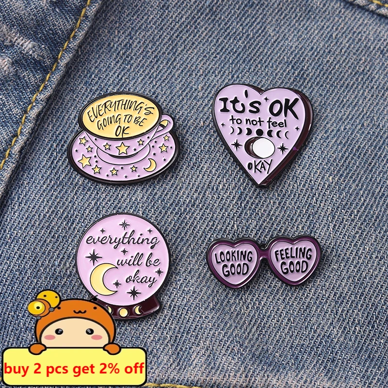 Эмалевые булавки с фиолетовым сердцем, фазой Луны, мотивационные ци...