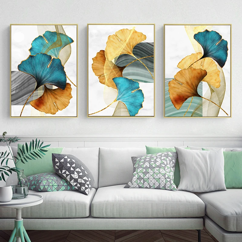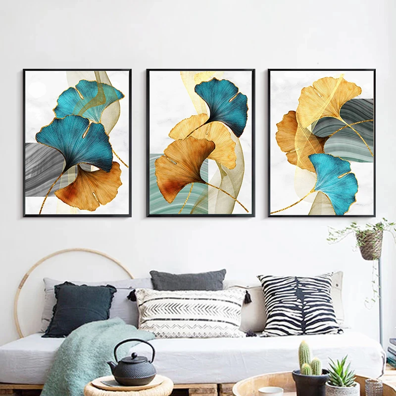 Абстрактный плакат, синий, зеленый, желтый, золотой, с изображением листьев, скандинавский холст, настенное искусство, украшения для гостиной, картина современного искусства