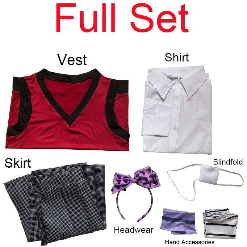 Аниме: компульсивный игрок KakeguruiПерсонаж: Ikishima MidariКомплект: жилет + рубашка + юбка + головной убор + аксессуары для рук + маска для глаз + носки.Парик: около 35 см в длину, черный и фиолетовый, импортный высокотемпературный шелк, окружность головы 50-60 см.