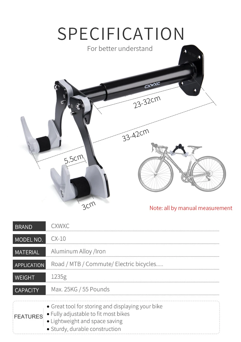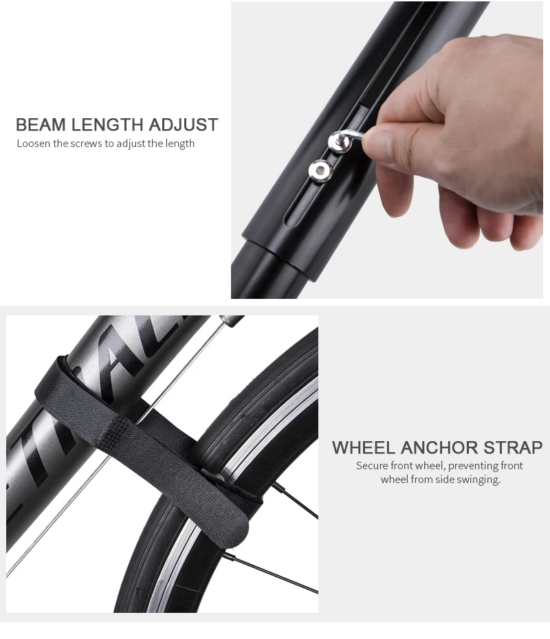 1. Вмещает до 55 фунтов (25 кг)2. Широкое применение, руль совместим до 31,5 " (800 мм) в ширину3. Гибкая Рамка колыбели не царапает вашу краску или раздавить кабели4. Независимые регулируемые руки с нажатием кнопки5. Включает ремень для стабилизации колеса6. Прочная алюминиевая рама не будет колебаться, как другие настенные крепления