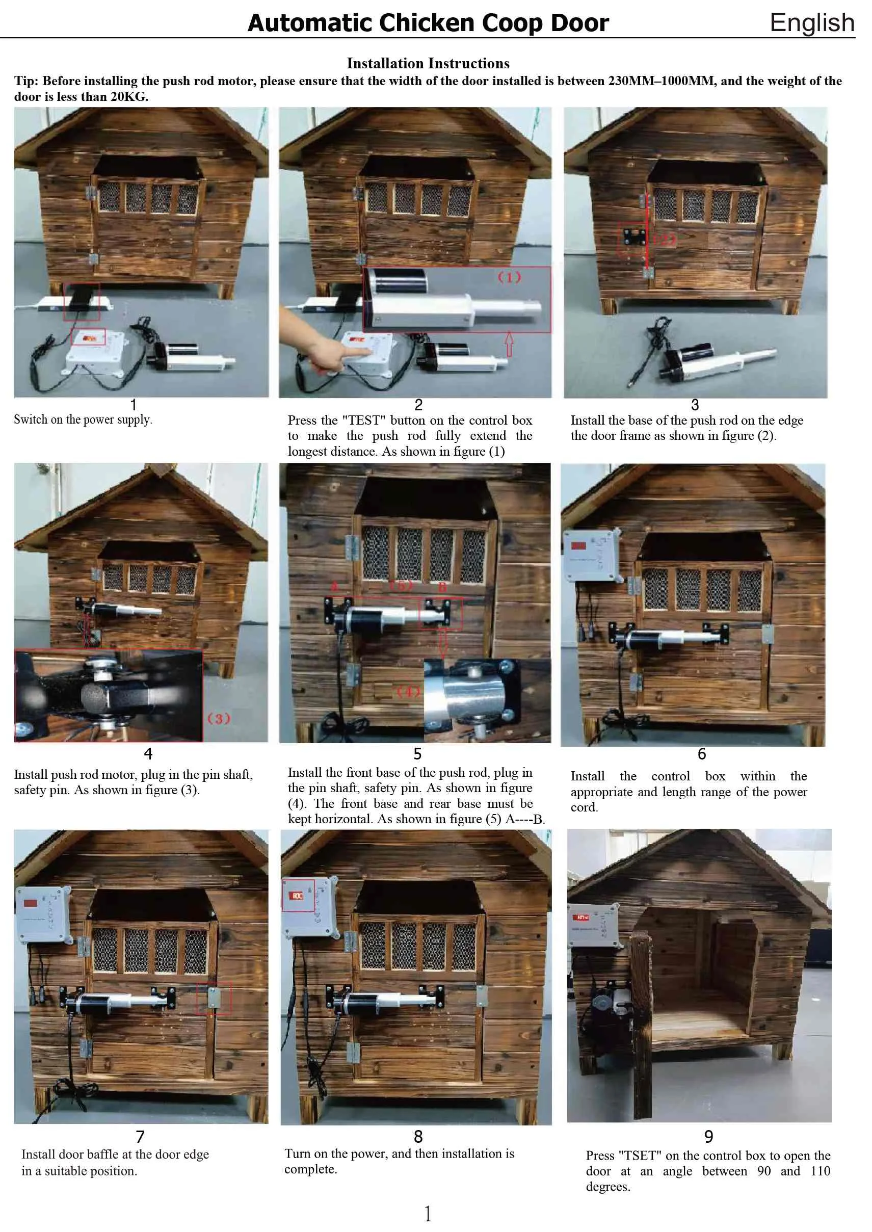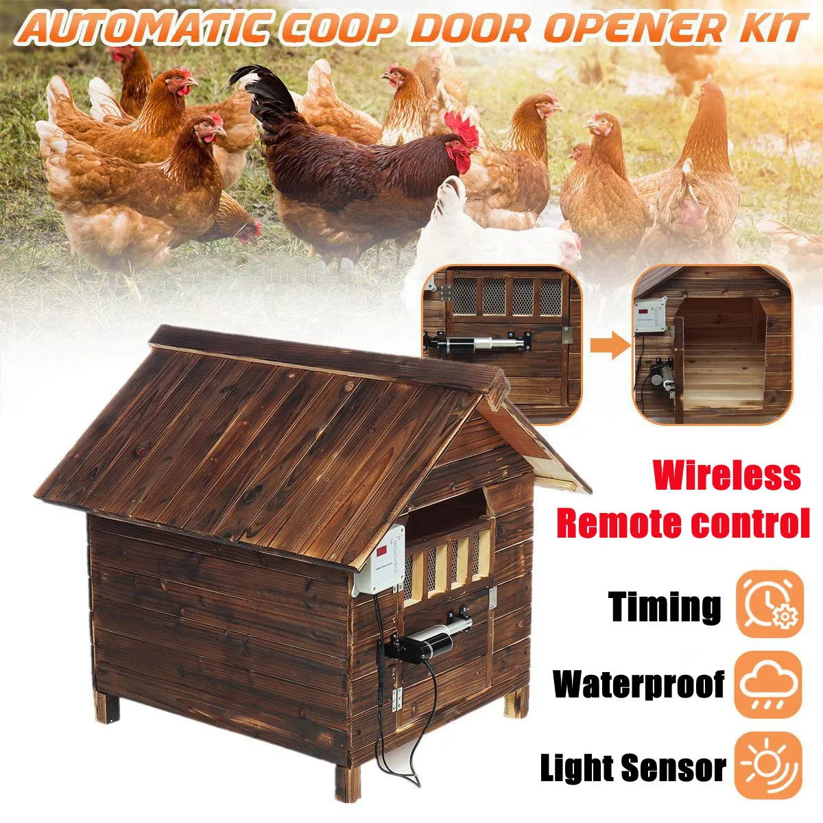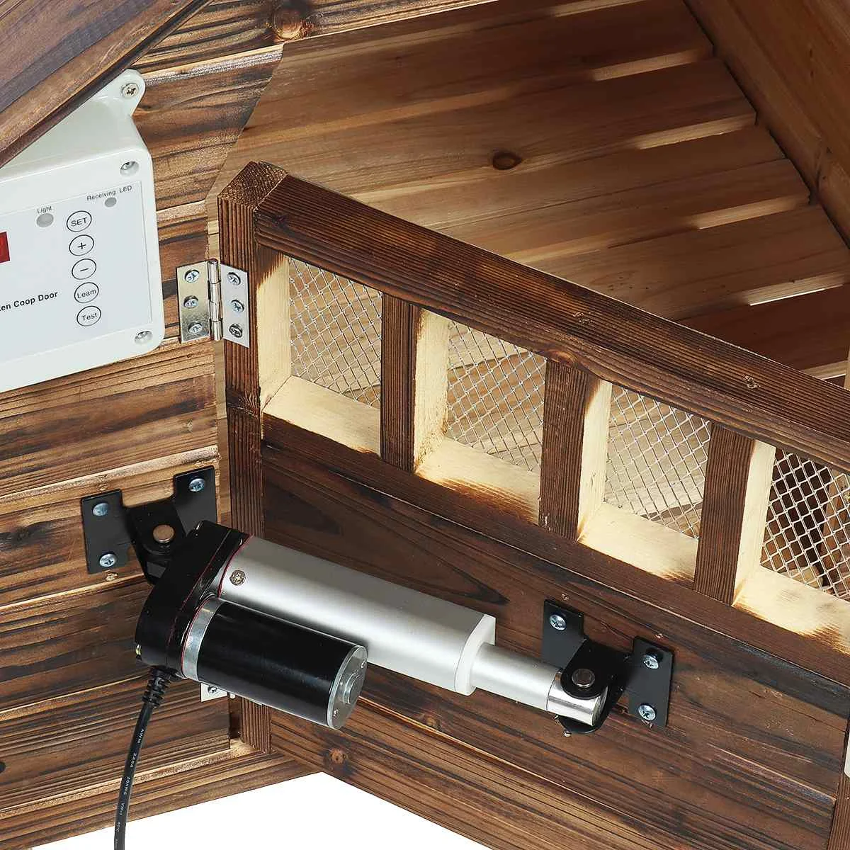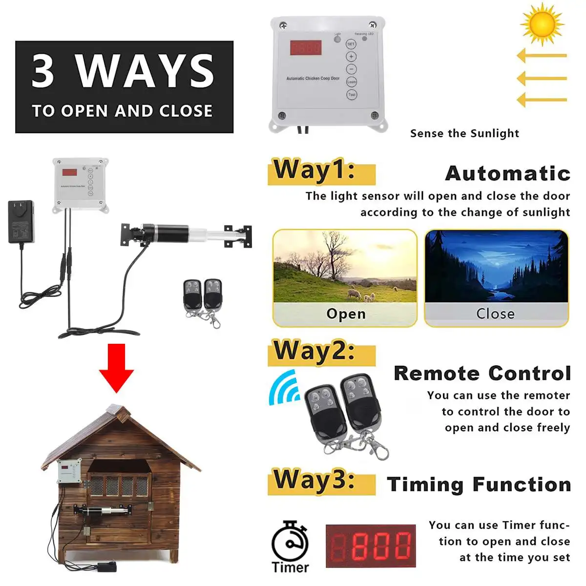 ● Простота в использовании-открывайте утром и закрывайте вечером автоматически, установив таймер или используя легко отрегулированный датчик солнечного света. Автоматические открыватели дверей экономят вас на вставках утром и защищают ваших цыплят от хищников.