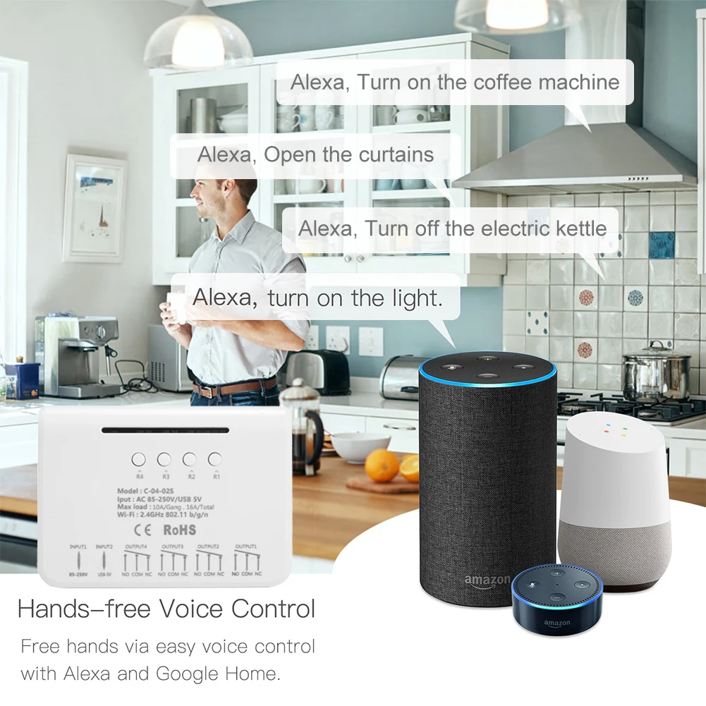 Этот продукт является 4-канальный универсальный WiFi беспроводной смарт-переключатель с RF 433 МГц RF модуль, для вашей системы «умный дом», чтобы удаленно и автоматического включения/выключения бытовой техники и электронных устройств с помощью приложения для телефона. Его также можно контролировать с помощью пульта дистанционного управления RF в помещении. Он может одновременно подключать и управлять четырьмя приборами в приложении, и вы можете самостоятельно включать/выключать каждую из четырех банд. Он также поддерживает включение/выключение устройств в определенное время и делиться ими с другими, чтобы вы могли контролировать свой умный дом вместе с семьей. Вы также можете управлять своей бытовой техникой через Amazon Alexa, а также для Google home/Nest,IFTTT и наслаждаться умной жизнью и сделать свой дом умнее.