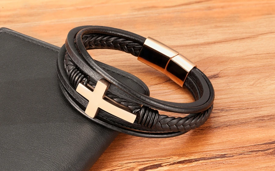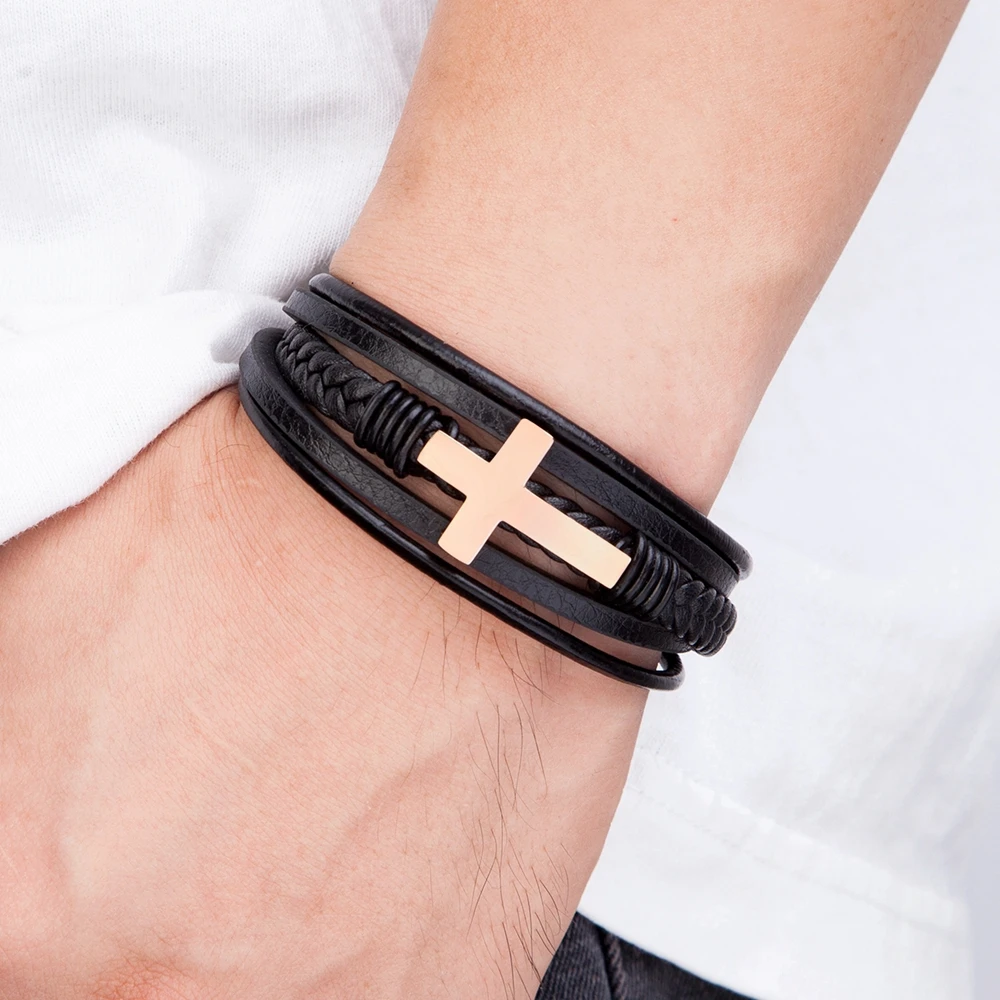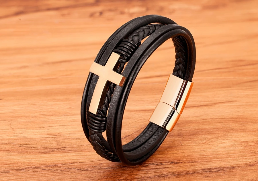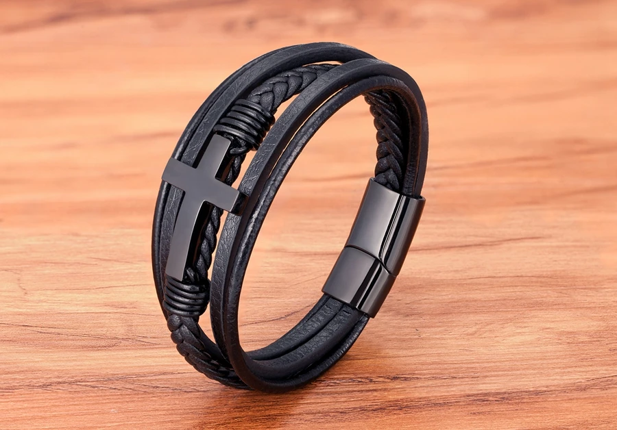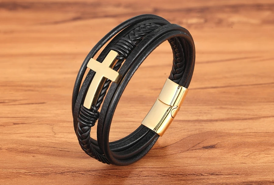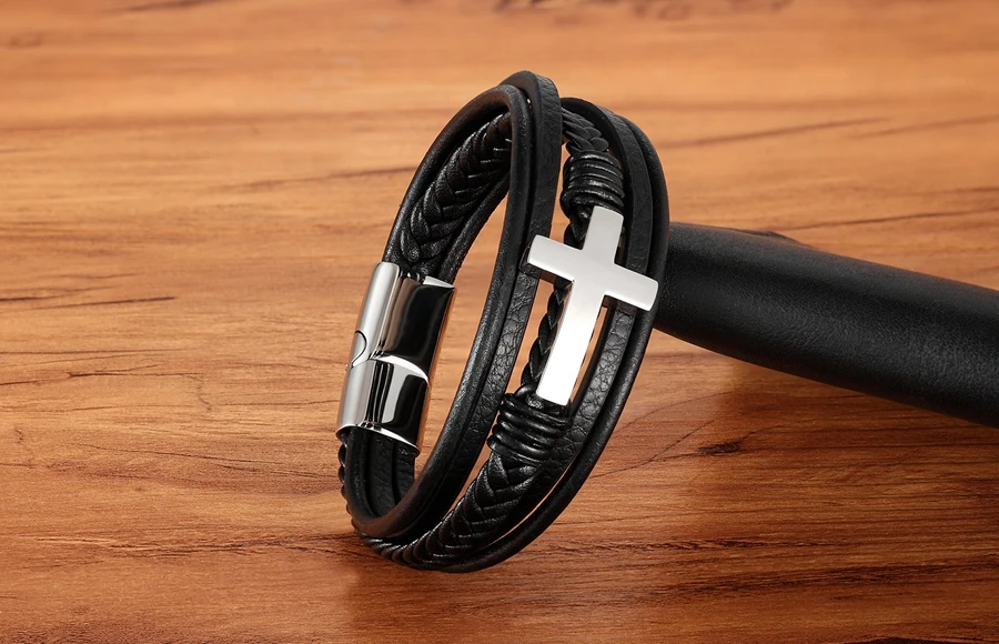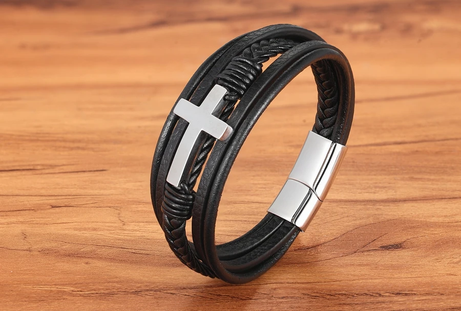 Мужские магнитные ювелирные изделия, многослойная нержавеющая сталь кожаный перекрестный браслет, браслет с застежкой