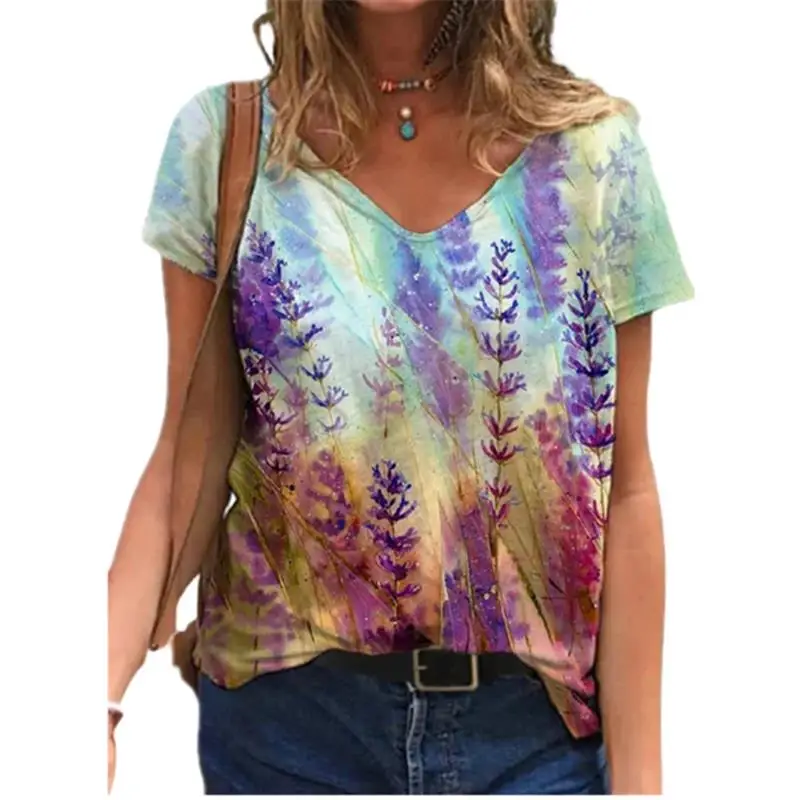 Женская футболка с коротким рукавом, V-образным вырезом и цветочным...