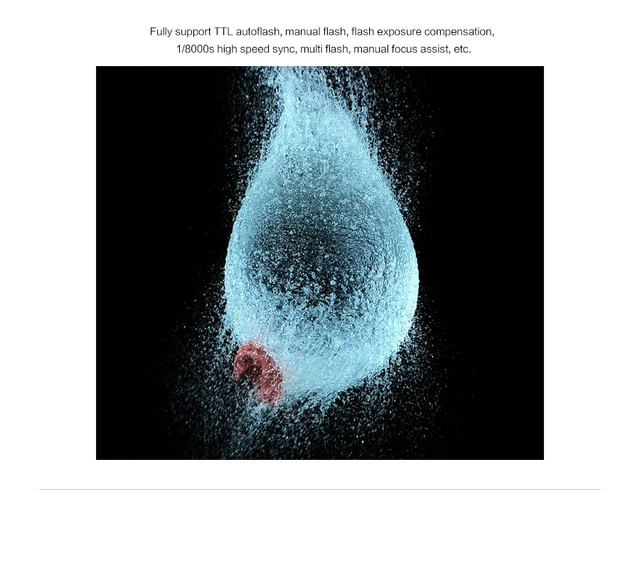 Источник питания: внешний блок питания (PB960: 11,1 В 4500 мА · ч) при использовании с триггером X1, может использовать беспроводной пульт дистанционного управления вспышкой TTL, коэффициентом мощности, автофокусом и зуммером, И реализовать Запуск синхронизации вспышки.