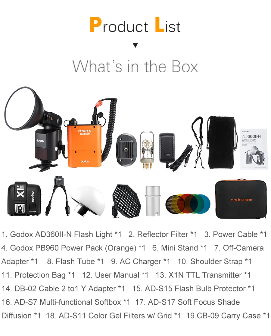 Вспышка Godox AD360II-N TTL Power ful Speedlite с блоком питания PB960, оранжевый + передатчик X1T-N TTL + семейный софтбокс + сумка для переноски