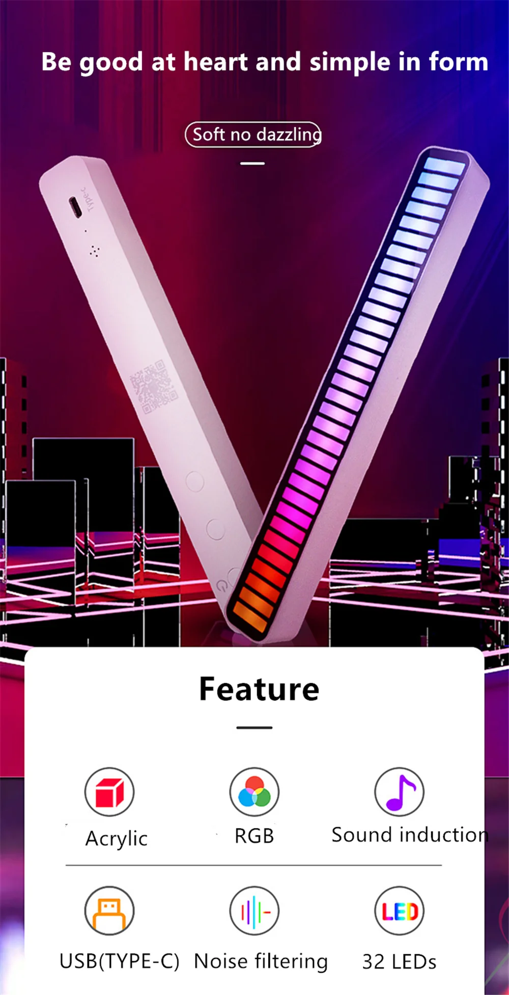 4. Тип обновления: индукция звукового поля, источник питания USB (Type _ C), может фильтровать шум окружающей среды, мобильный телефон, управление приложением: 7 статических режимов, 5 динамических режимов, 10 режимов захвата.Характеристики:Напряжение: 5 В/1 а постоянного токаВстроенный аккумулятор 300мАЗарядка: USB type_cМатериал: акрил + ПВХСветильник: 32/40 светодиодов на светильникЦвет: Дневной свет белый + RGB/Частотная характеристика: 100-16 кГц