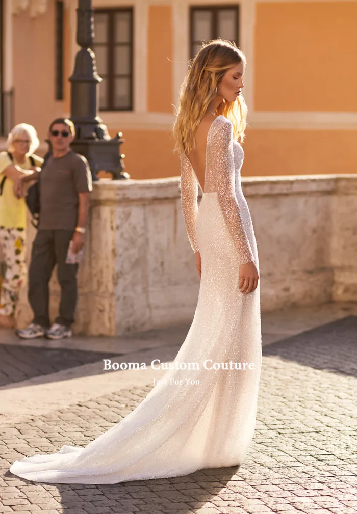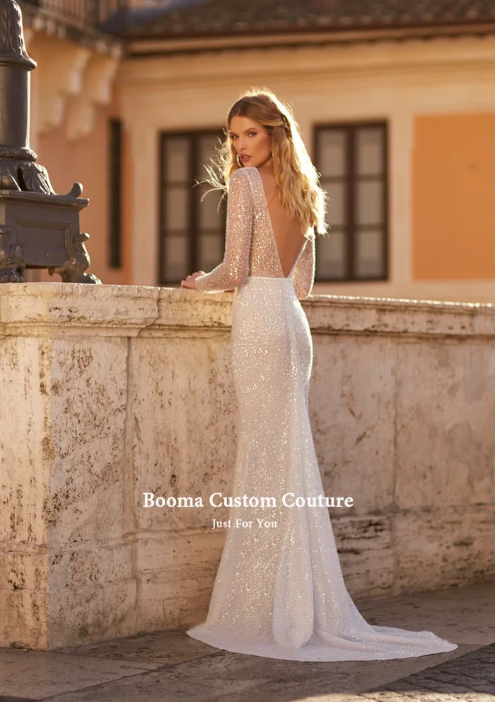 Женское свадебное платье с V-образным вырезом, длинным рукавом и блестками