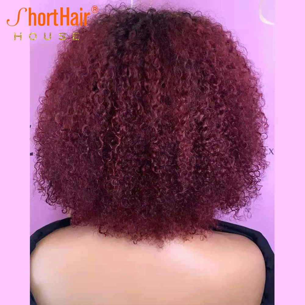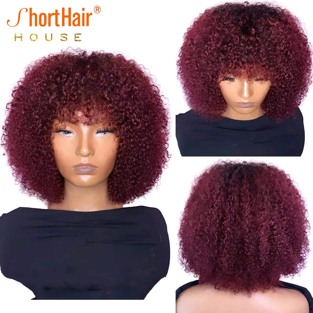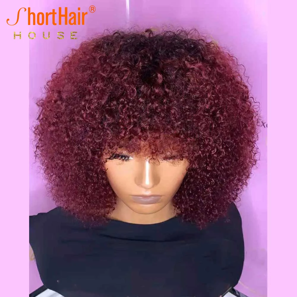 Парики из 100% человеческих волос красного цвета 99j для женщин, бразильский парик, короткий афро кудрявый парик с челкой, 180% плотность, машинное изготовление