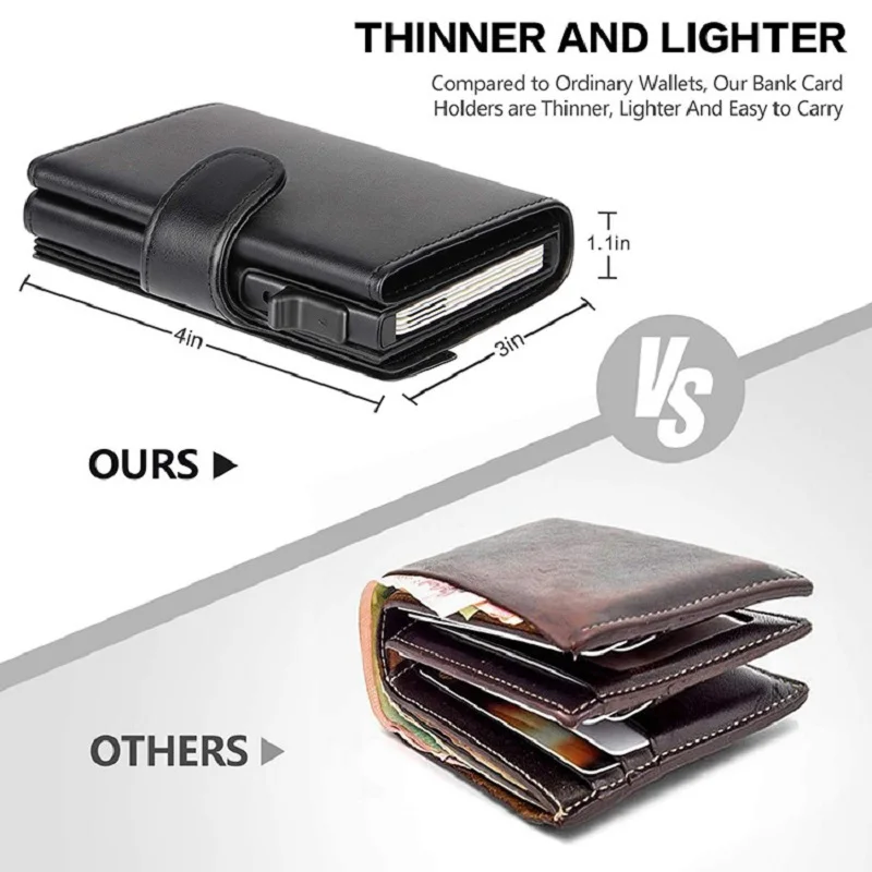 【Высококачественный материал 】-Чехол-бумажник для карт изготовлен из хорошего алюминия и кожи. Внешняя кожа обеспечивает комфорт в руке и кармане. Кошельки крепкие, хорошо сделаны. 【Rfid-блок 】-Блокировка RFID всплывающий держатель кредитной карты кошелек может идеально блокировать нежелательные RFID сканеры, включает технологию блокировки RFID для предотвращения несанкционированного доступа к личной информации, защиты ваших RFID кредитных карт, дебетовых карт, идентификационные карты из электронного кармана. Это безопасно и хорошо подходит для путешествий RFID кредитный держатель для карт. 【Тонкий минималя】-Тонкий и красивый вид. Модный тонкий дизайн делает держатель для карт более элегантным и винтажным. Он включает в себя портмоне и металлический чехол отсек с pop up кнопка, которая может держать около 5-6 карт, плюс имеет 2 дополнительных кармана в кошельке, которые могут быть использованы для других карт (водительские права, страховые карты и т. Д.), и отсек для хранения небольших наличных денег или счетов. Этот маленький кошелек держит все, что вам нужно! Это облегчает жизнь 【Легко использовать 】-Умный дизайн! Различные формы бумажника для кредитных карт, бумажника с удобной функцией всплывания, все карты постепенно выскакивают, что позволяет легко найти, какую карту вы ищете. Карты не выпадают и являются хорошим мужским умным кошельком. Нет проблем, чтобы держать его в переднем/заднем кармане. Не ломается, не изгибается. 【Модный и практичный 】-Практичный кошелек! Отлично подходит для ежедневного использования, путешествий, поездок, покупок, высокого качества и разумной цены, также хорошо подходит в качестве подарка для друзей, семьи. Вашим друзьям и семье понравится этот элегантный, прочный, удобный кожаный бумажник! Описание: Материал: кожа, алюминий Цвет: черный Размеры: 10*7,5*2,5 см Посылка включает в себя: 1 * кошелекИзысканная подарочная упаковка: