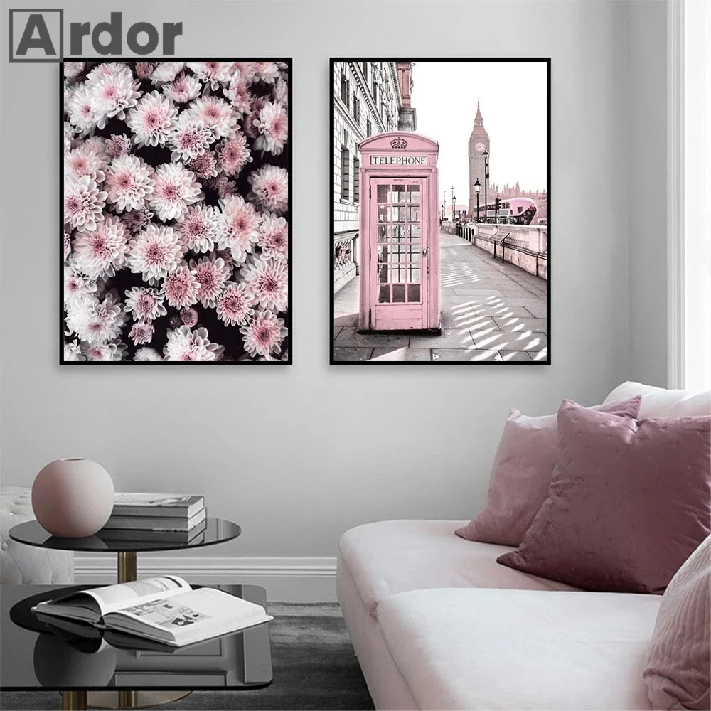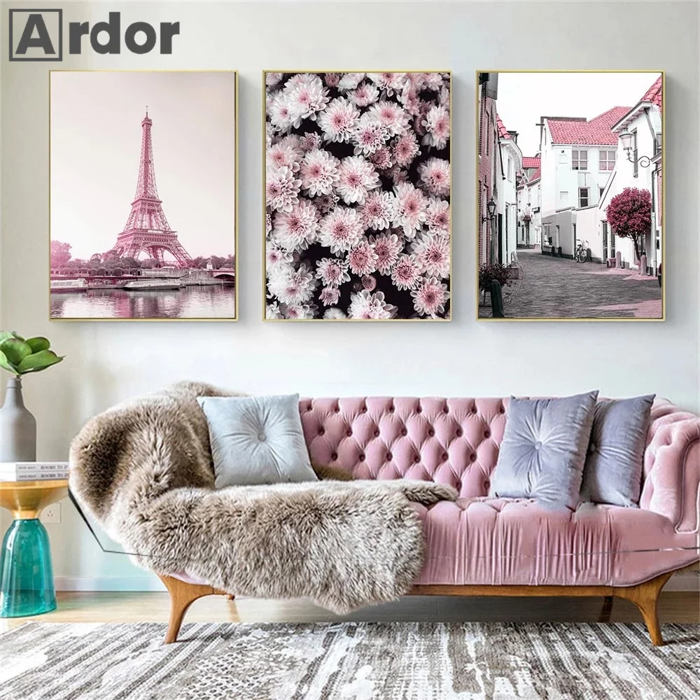Скандинавский постер с розовыми цветами, Эйфелева башня, Художестве...