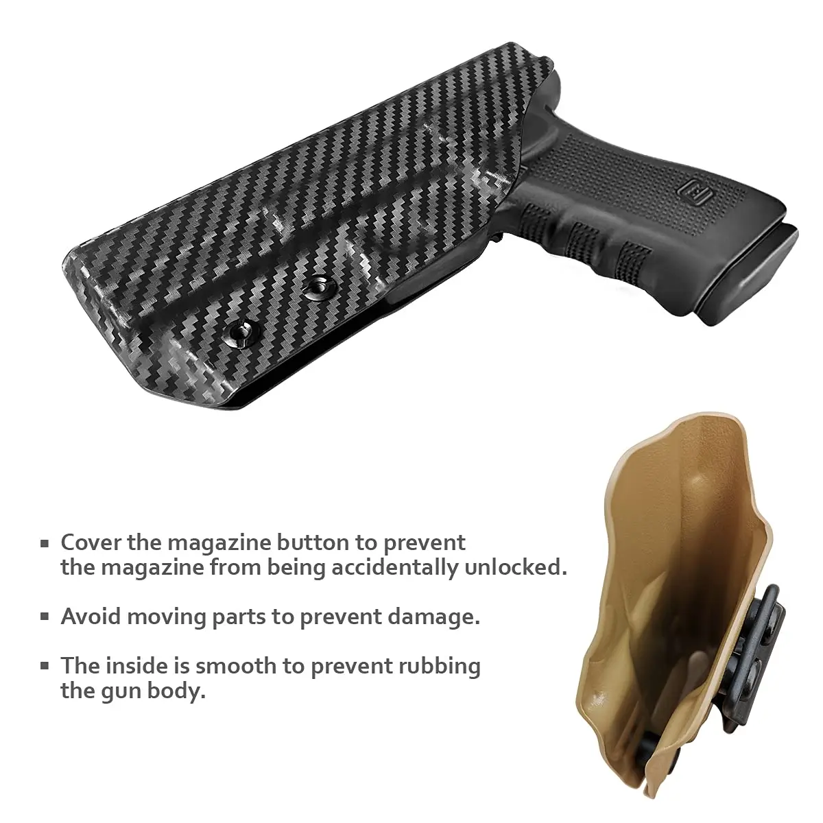 US .08 ”углеродное волокно KYDEX ручной работы: легкий, прочный, прочный, влагозащищенный и моющийся, обеспечивает комфорт и уверенность в любой ситуации. Чехол Glock 17 покрывает весь корпус, эффективно предотвращая пот и избегая фиксации одежды, можно безопасно и безопасно использовать.
