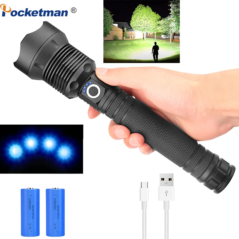 Мощный светодиодный фонарик с использованием лампы XHP70.2 светодиодный фонарь с максимальной мощностью до 90000 люменовУвеличьте 2*18650 или 2*26650 аккумуляторный отсек, чтобы увеличить время работы.Дисплей емкости аккумулятора, телескопический зумМикро-usb для компьютера usb, Автомобильный USB, usb-разъем для зарядки, зарядный фонарикИзготовлен из авиационного алюминиевого сплава прочный HAIII военный класс Жесткий анодированныйВодонепроницаемый в соответствии с IPX-6, водостойкий, может использоваться в дождливую погоду, но не может положить его в водуПодходит для работы, охоты, альпинизма, рыбалки, кемпинга и активного отдыха и т. д.Ударопрочный до 2 метров