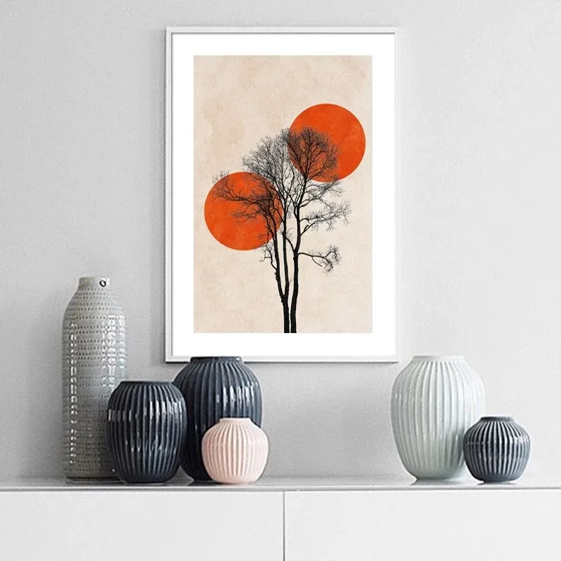 Абстрактный постер в скандинавском японском стиле, зимний утренний пейзаж, Настенная картина, красное солнце, мертвое дерево, Картина на холсте, домашний декор