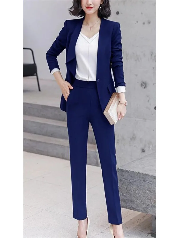 Женский брючный костюм, темно-синий пиджак + брюки, женские деловые костюмы, блейзер, официальная офисная форма, стильные женские брюки, костюм