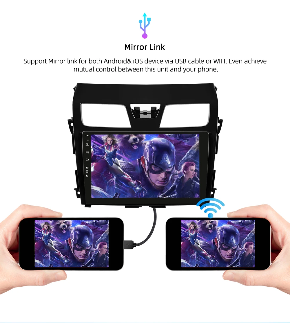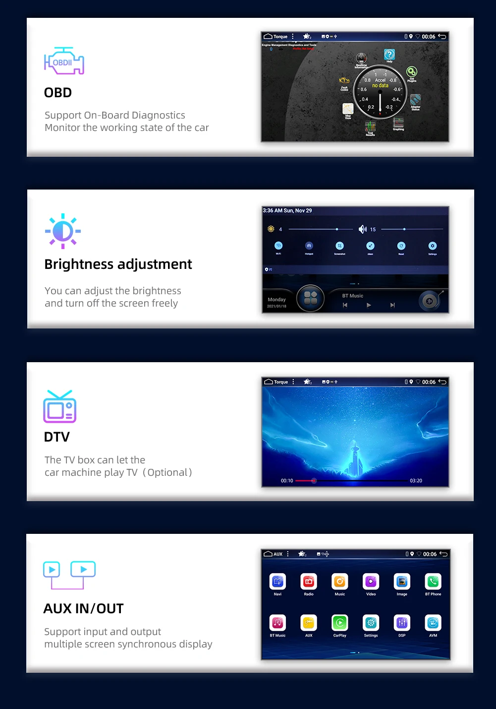 ● Встроенный Android Auto & Apple CarPlay,Android Auto & Apple CarPlay принимает то, что вы хотите сделать с вашим телефоном во время вождения, и кладет их на встроенный дисплей вашего автомобиля. Вы можете получать указания, совершать звонки, отправлять и получать сообщения, а также слушать музыку, таким образом, чтобы вы могли оставаться сосредоточенными на дороге. Просто подключите телефон и перейдите. Вы также можете использовать управление рулевым колесом.