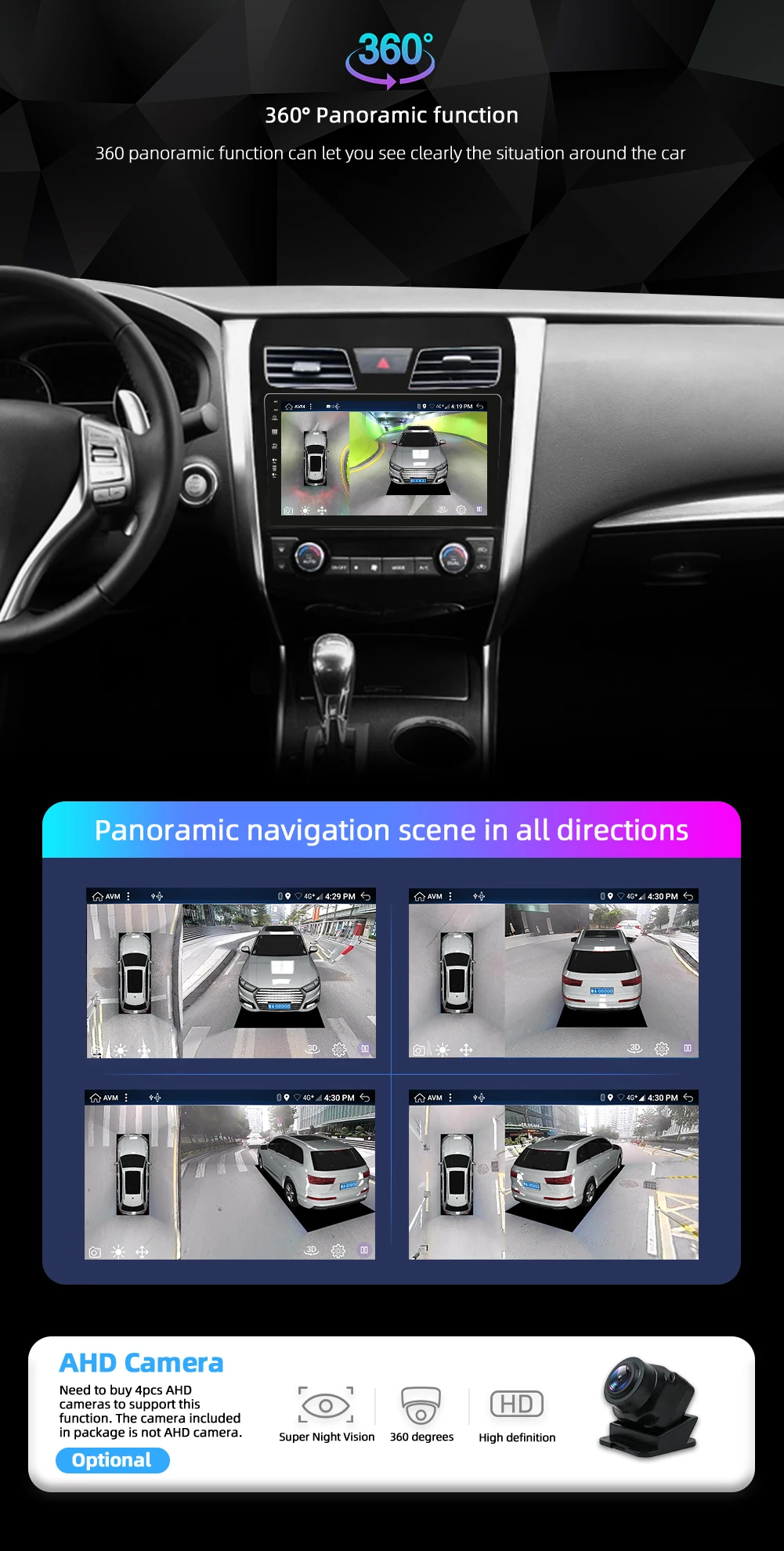 ● Поддержка панорамной функции 360 градусов, HD 3D 360 ° панорамная, чтобы сделать вас более безопасным вождением и легким задним ходом. (необходимо дополнительно купить 4 камеры AHD для поддержки)