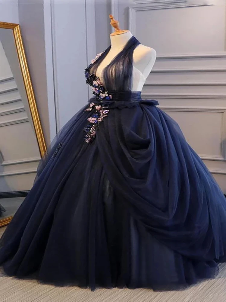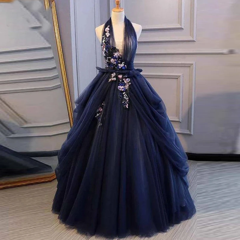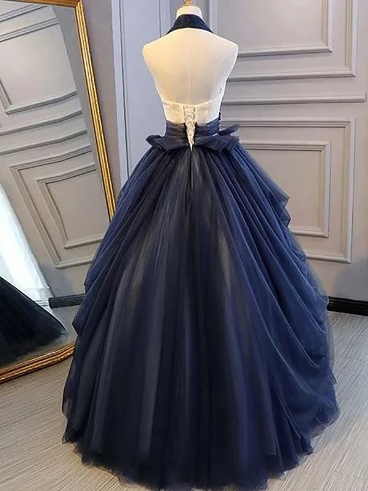Темно-синее длинное милое платье на бретелях с V-образным вырезом, 16 платьев, платье для выпускного вечера с открытой спиной, пышные Вечерние платья из тюля для встречи выпускников