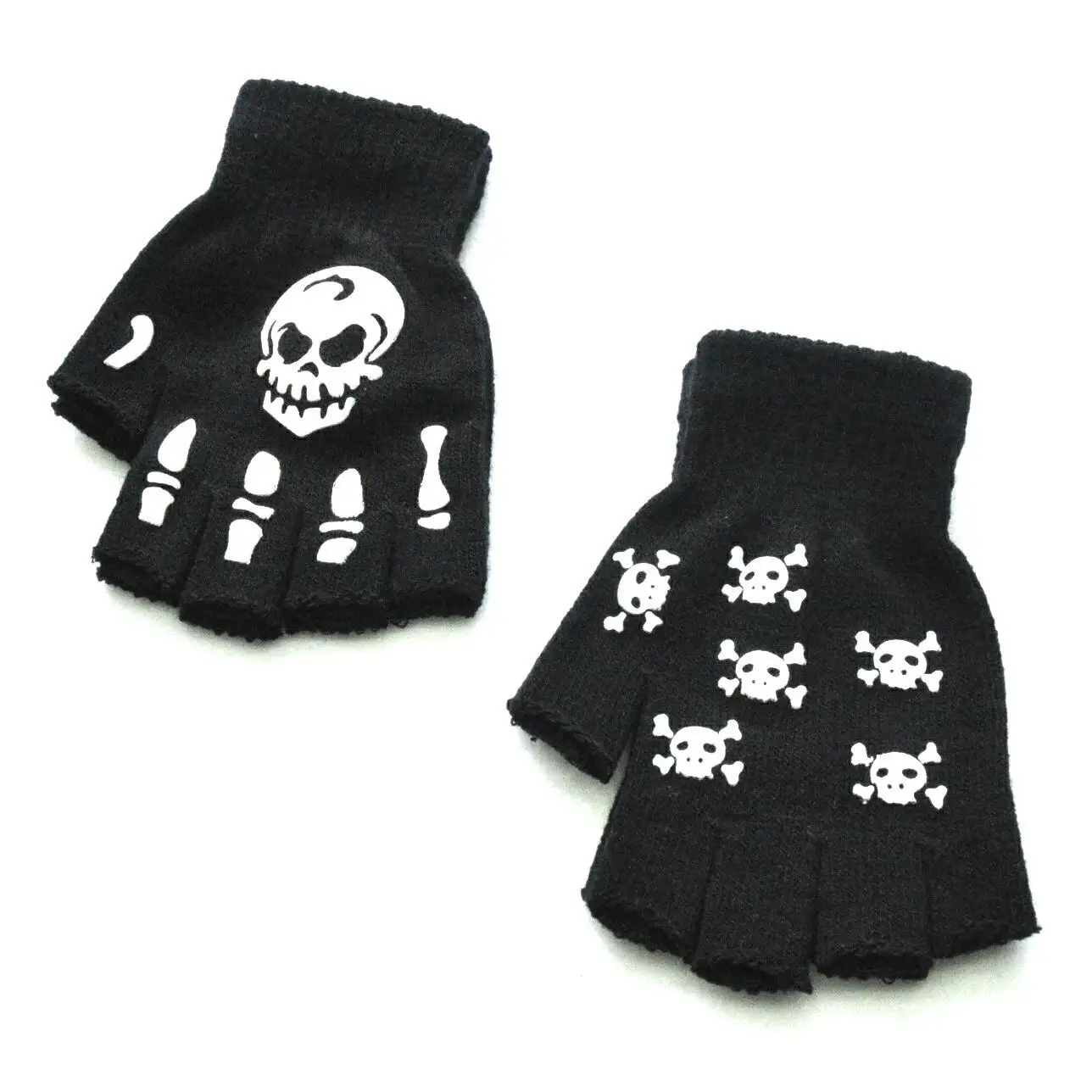 Флуоресцентные вязаные перчатки с принтом скелета черепа, крутые осенне-зимние черные вязаные перчатки для верховой езды для детей