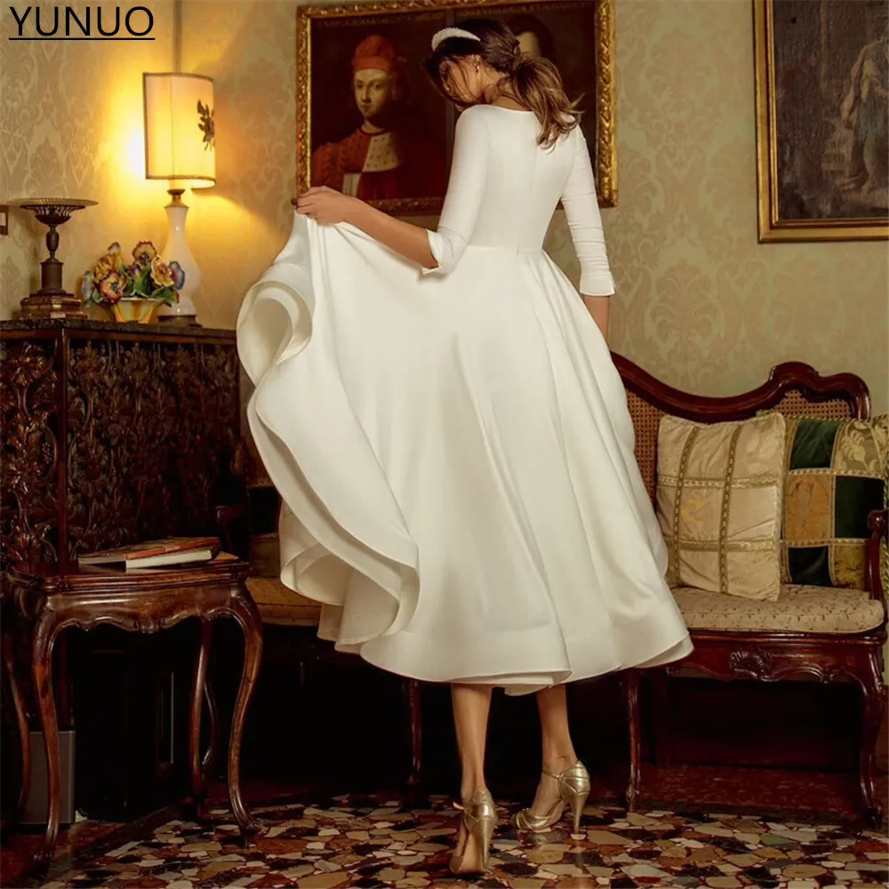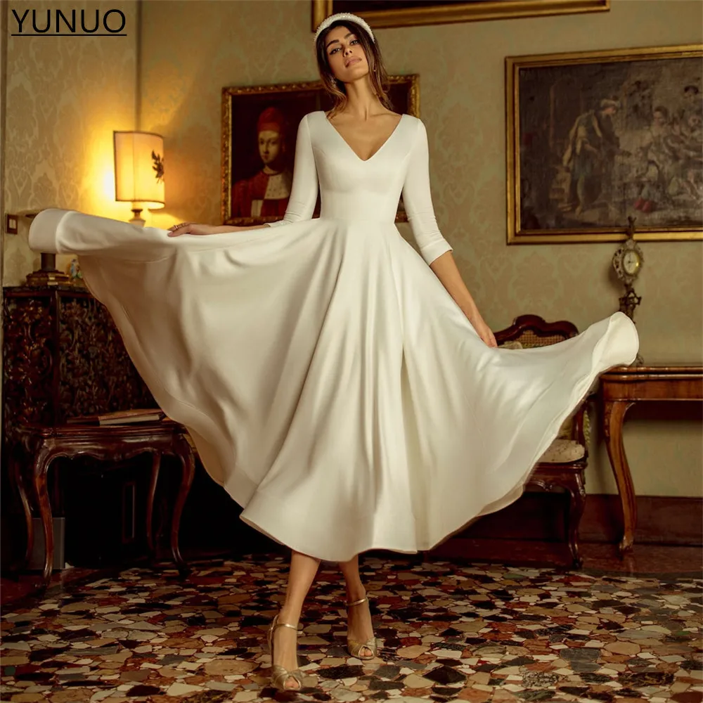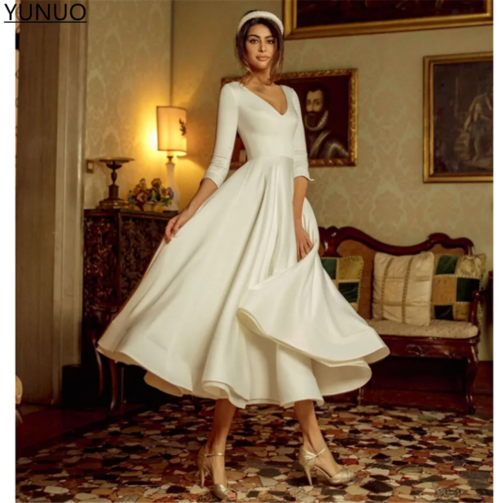 Короткое свадебное платье YUNUO, атласное ТРАПЕЦИЕВИДНОЕ ПЛАТЬЕ средней длины с длинным рукавом, V-образным вырезом, пляжное платье невесты, цвета слоновой кости, белого цвета, для невесты,