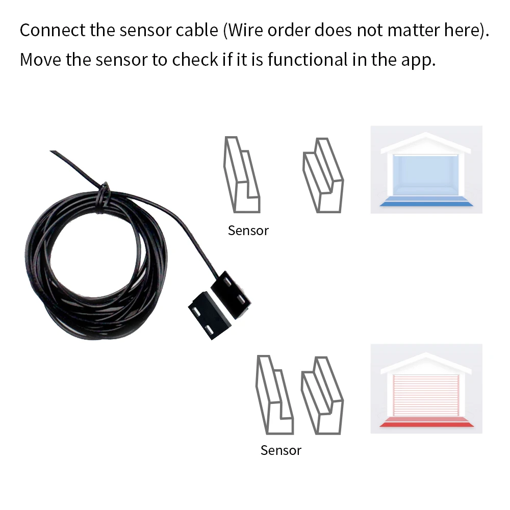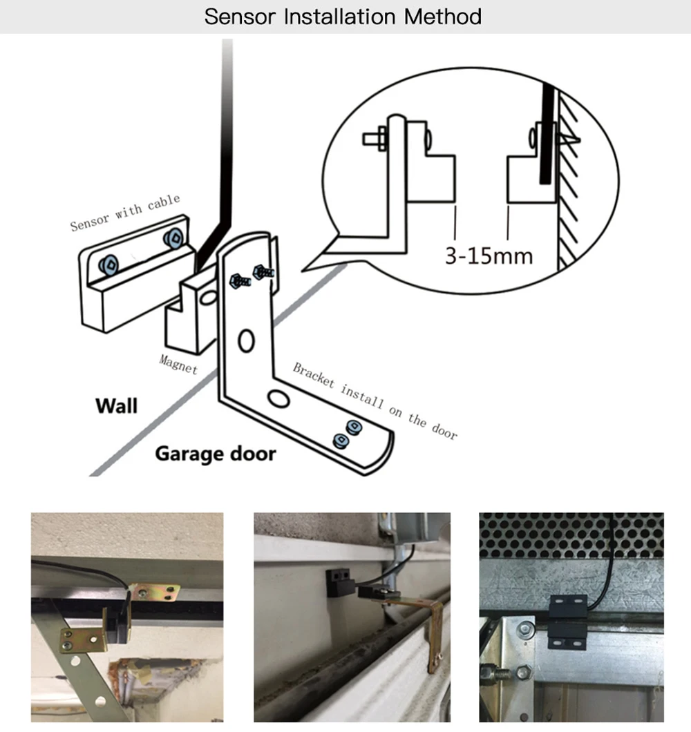 Найдите правильное положение на двери гаража для крепления датчика (вы можете использовать прилагаемые двухсторонние клейкие ленты, винты или кронштейныДля фиксации датчика). Пожалуйста, убедитесь, что расстояние между двумя датчиками составляет менее 20 мм, когда дверь гаража закрыта, и два датчика хорошо разделены, когда дверь гаража открыта.