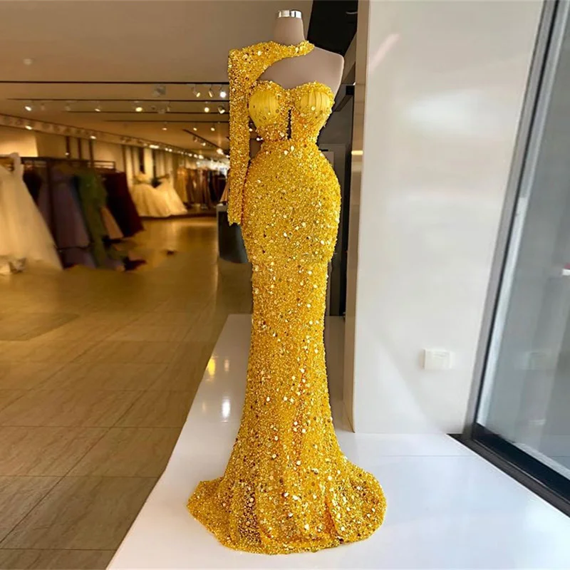 Женское вечернее платье с юбкой годе Gillter, золотистое блестящее платье на одно плечо с длинным рукавом и шлейфом, 2022
