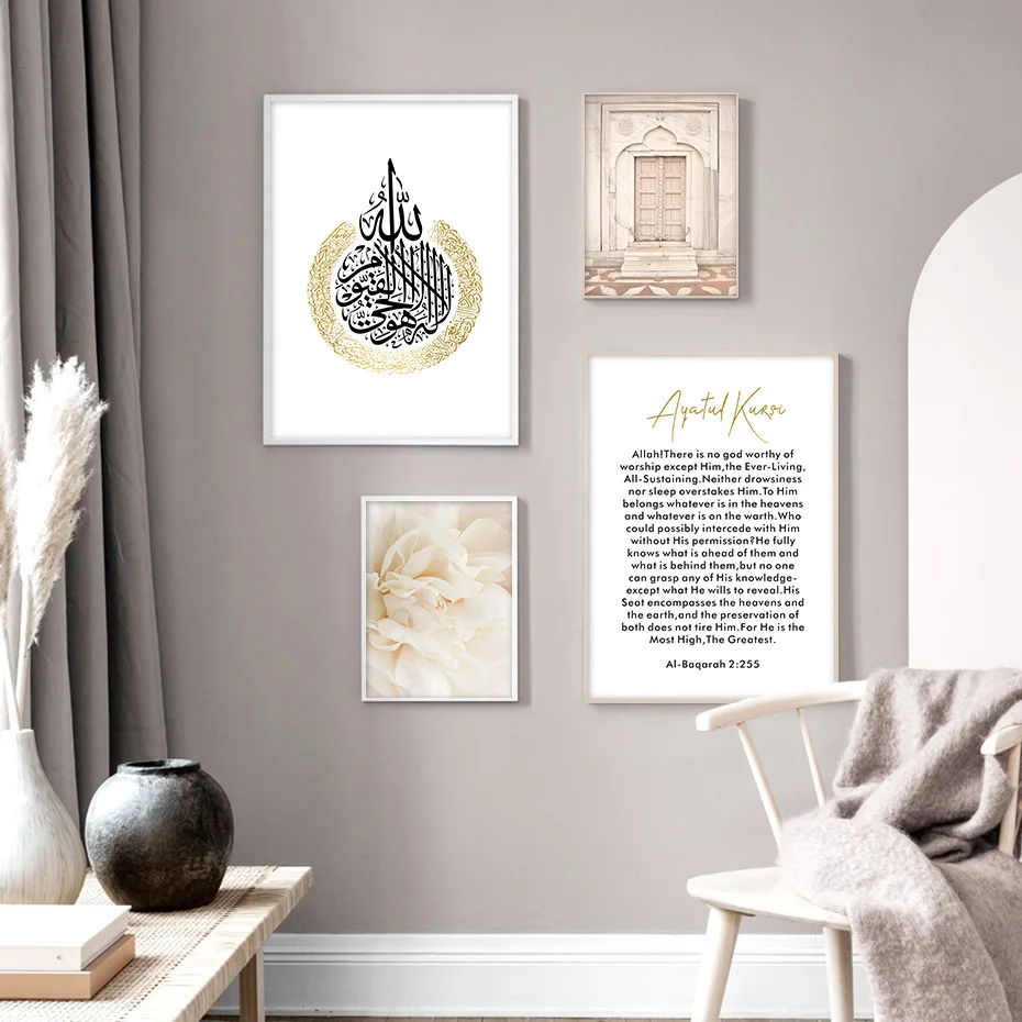 Бежевые цветущие цветы Марокканская дверь исламский Ayatul Kursi постеры Bismillah Настенная картина на холсте картины для домашнего декора