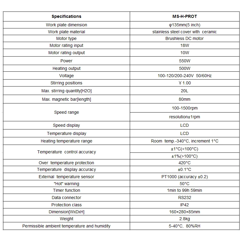 Ключевые особенности• Бесщеточный двигатель постоянного тока не требует технического обслуживания и взрывозащищен• Цифровой контроль температуры с максимальной температурой при 340 °C• Цифровой контроль скорости с максимальной скоростью до 1500 об/мин• Максимальное количество перемешивания H2O при 20 л• Цепи безопасности обеспечивают защиту от перегрева• «Горячее» предупреждение будет мигать, если температура пластины выше 50 °C даже при выключении горячей пластины• Функция таймера широкого диапазона от 1 мин до 99h59min (только MS-H-ProT)• ЖК-дисплей с высоким разрешением показывает фактические температуры и скорость (MS-H-ProT отображает время также)• Внешний контроль температуры можно путём подключения датчика температуры (герметизирующая ptfe-лента для 1000) с точностью на ± 0,2 °C• Рабочая пластина из нержавеющей стали с керамическим покрытием обеспечивает хорошую химическую устойчивость• Функция дистанционного управления обеспечивает управление ПК и передачу данных• Широкий различные аксессуары доступны