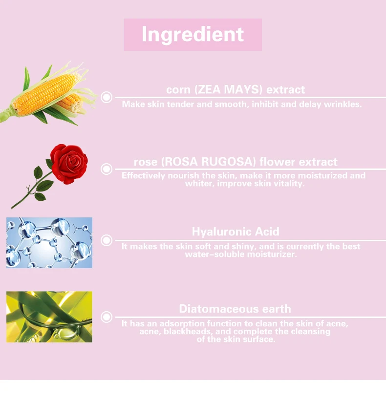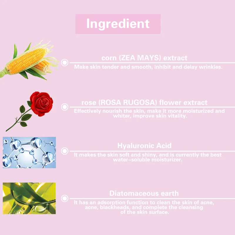 Роза: выравнивает и освещает цвет лицаРомашка: успокаивает, восстанавливает чувствительную кожу, уменьшает покраснениеКиви: деликатная, успокаивает и увлажняет кожуЛавандер: разглаживает, питает и освежает кожуВишня: балансирует и освещаетЗолото: против морщин, осветление и укреплениеМатча: жирная кожа-очищает и очищаетМята: чувствительная кожа восстанавливает, успокаивает и увлажняет кожуJASMIN: осветляет, увлажняет и увлажняет кожу