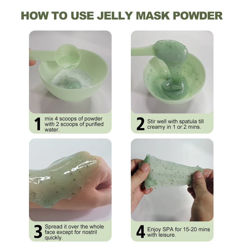 1. Смешайте 4 или 5 совков порошка с 2 совками очищенной воды.(Для более плотной маски можно смешивать 6 совков порошка с 2 совками воды)2. Хорошо размешать шпателем до кремового в течение 1 или 2 минут.3. Разложите его по всему лицу, за исключением ноздри быстро4. Наслаждайтесь спа 15-20 минут отдыха.5. Снимите маску с края и сделайте обычный уход за кожей, чтобы блокировать воду.Рекомендуется 1 или 2 раза в неделю.Примечание: Как удалить всю маску для лица в одном экземпляре?Сначала снимите маску с каждого края и снимите маску по нижнему краю. Скрутите маску во время снятия, так что вы можете легко получить полный лист в одно время.Если маленький край высохнет, сначала можно намочить края маски, затем повторить операцию, как показано выше.