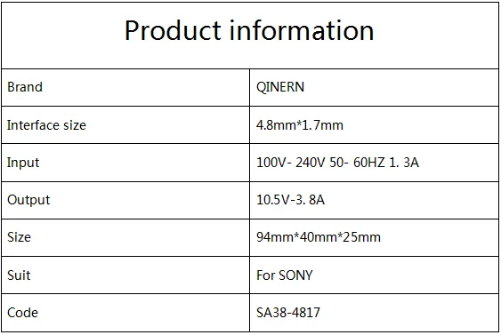 Артикул: 40 Вт 10,5 V 4.8A ноутбук адаптер питанияКод: SA38-4817Вход переменного тока: 100-240 В, 50 - 60 Гц 1.3AВыходное напряжение/ток постоянного тока: 10,5 в 3,8 аМощность блока питания: 40 ВтРазмер разъема постоянного тока: 4,8*1,7 ммВилка питания: США опциональноКостюм: Для SONY