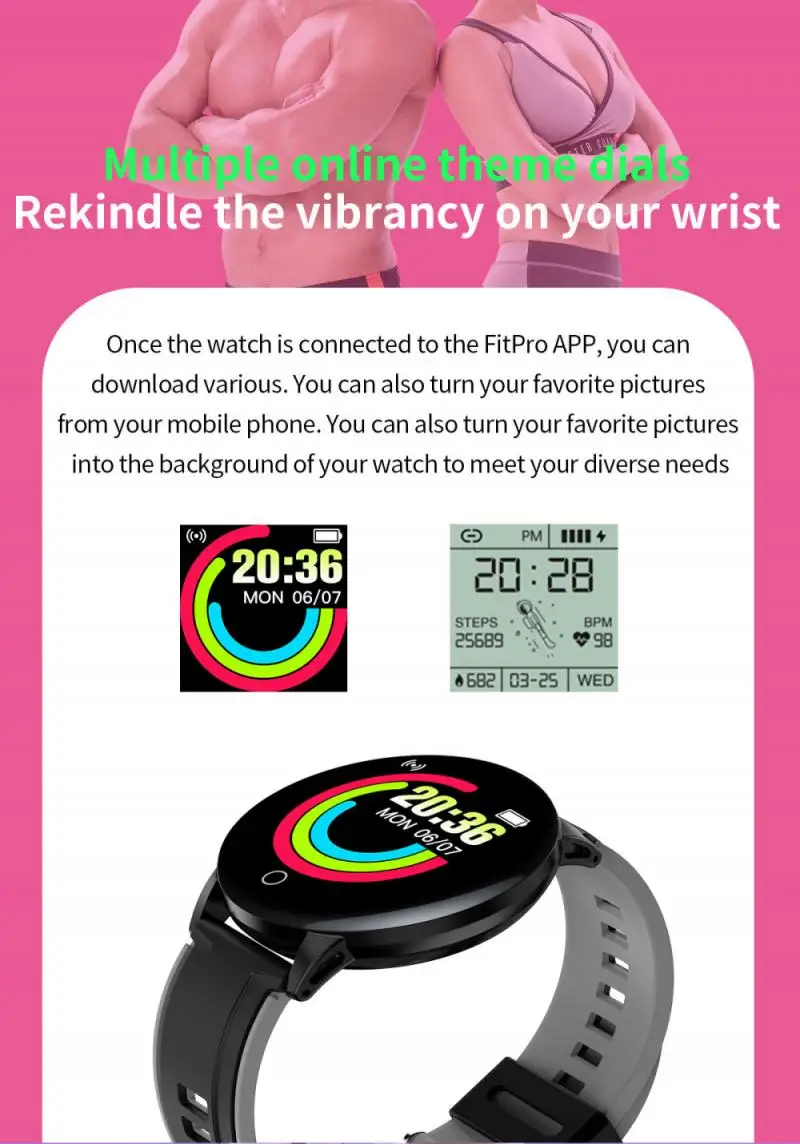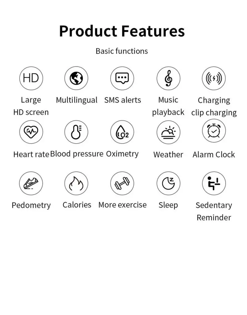 3.IP65 водонепроницаемый для повседневной жизни, мульти-спортивный режим, подходит для занятий спортом на открытом воздухе. Автоматически записывает ежедневный шаг движения и данные о калориях.