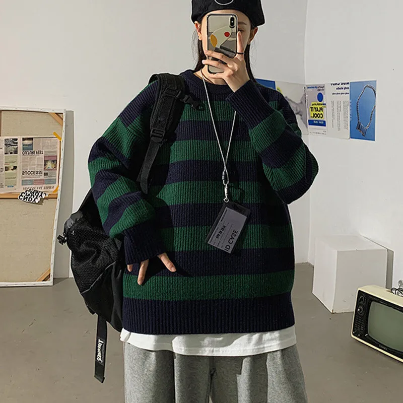 Осенний вязаный свитер в полоску, повседневные Пуловеры оверсайз, топы в стиле Харадзюку, Свободный теплый джемпер, женские свитера для девочек-подростков, уличная одежда