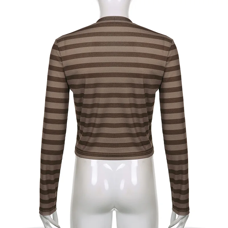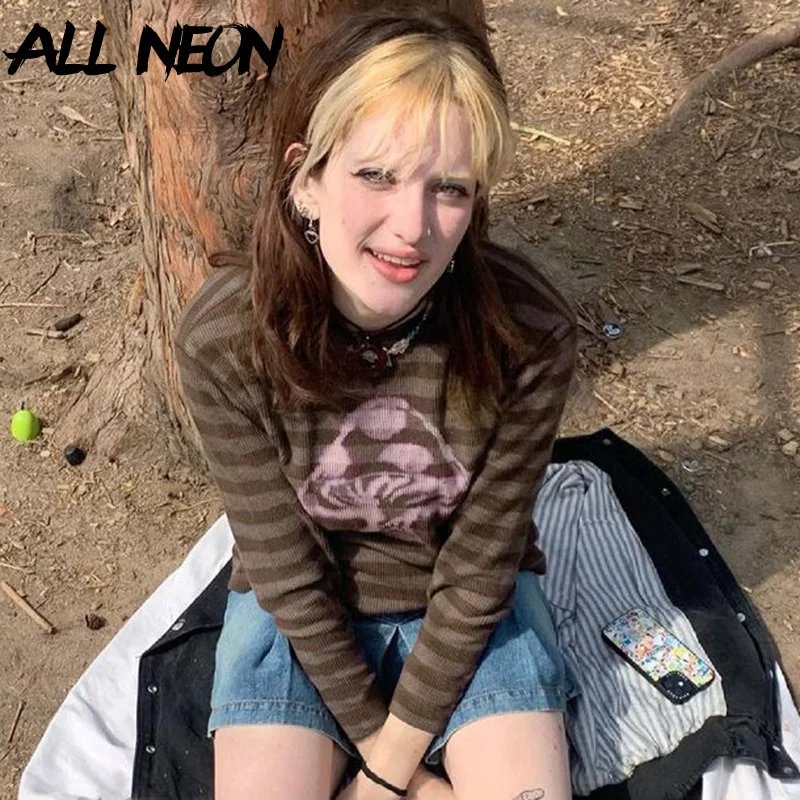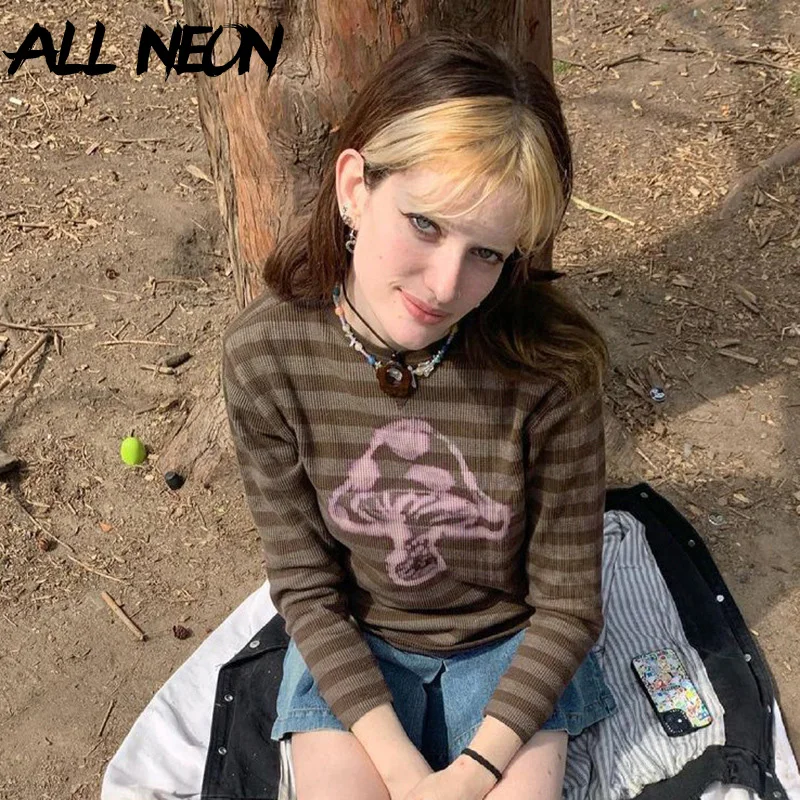 ALLNeon Goblincore эстетические полосатые футболки с рисунком грибов гранж Фея укороченные топы с длинным рукавом и круглым вырезом футболки для E-girl осень