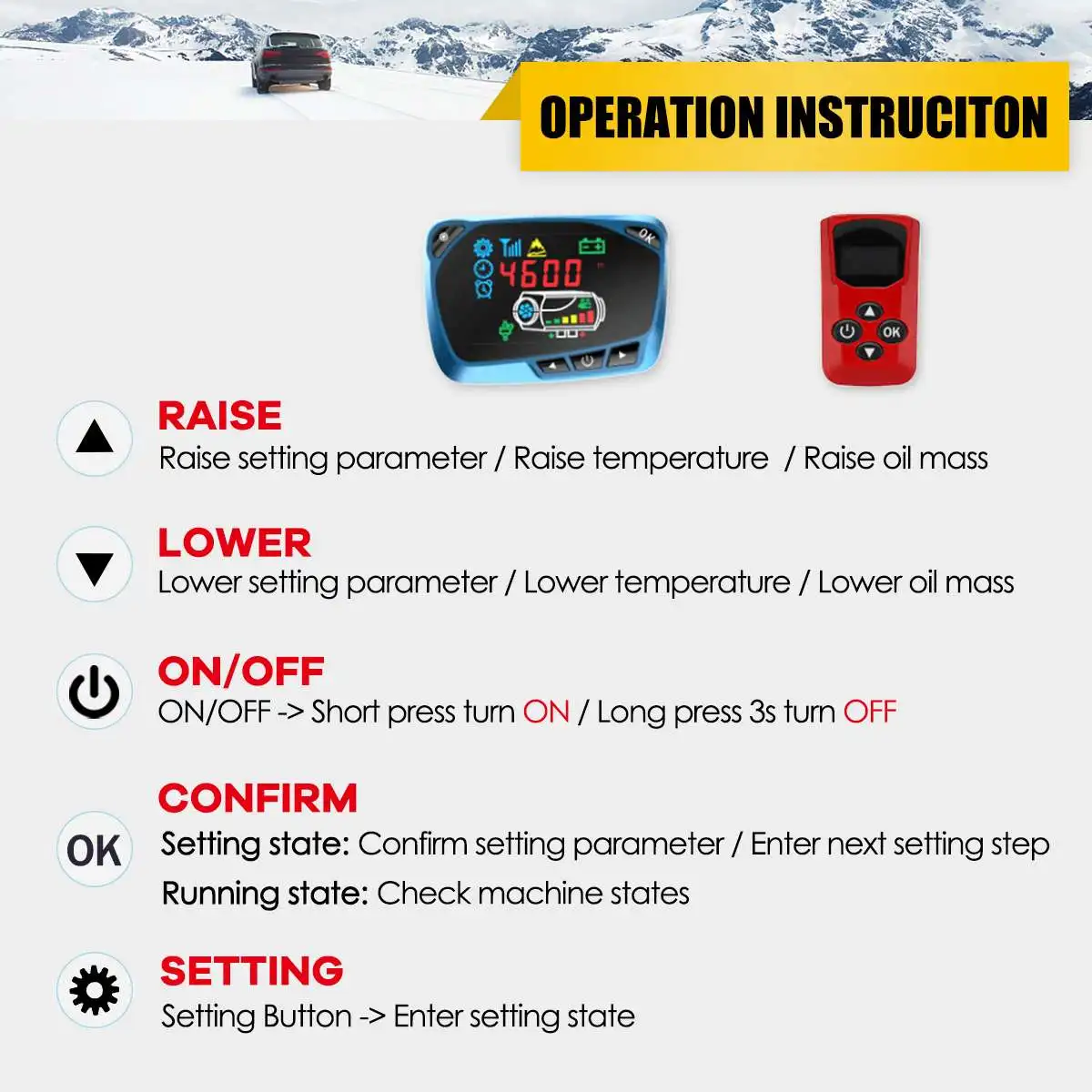 Особенности-Все в одном блоке, экономит место и легко перемещается.-Простота установки, удаления и обслуживания.-Избавьтесь от повреждения автомобиля, вызванного резким падением температуры.-Низкий уровень шума: снижение уровня шума при минимальном уровне шума.-Простая установка: компактный дизайн хорошо подходит для использования в различных узких пространствах.-Низкое потребление топлива и энергии в течение более длительного периода эксплуатации.-Плавный, автоматический комнатный контроль температуры с предварительной установкой температуры.-С непрерывным мониторингом и диагностической системой.-Топливо поставляется из собственного бака транспортного средства.-Применимо к: различным дизельным механическим транспортным средствам, таким как автомобили, автобусы, RVs, грузовики, инженерные транспортные средства и т. д.