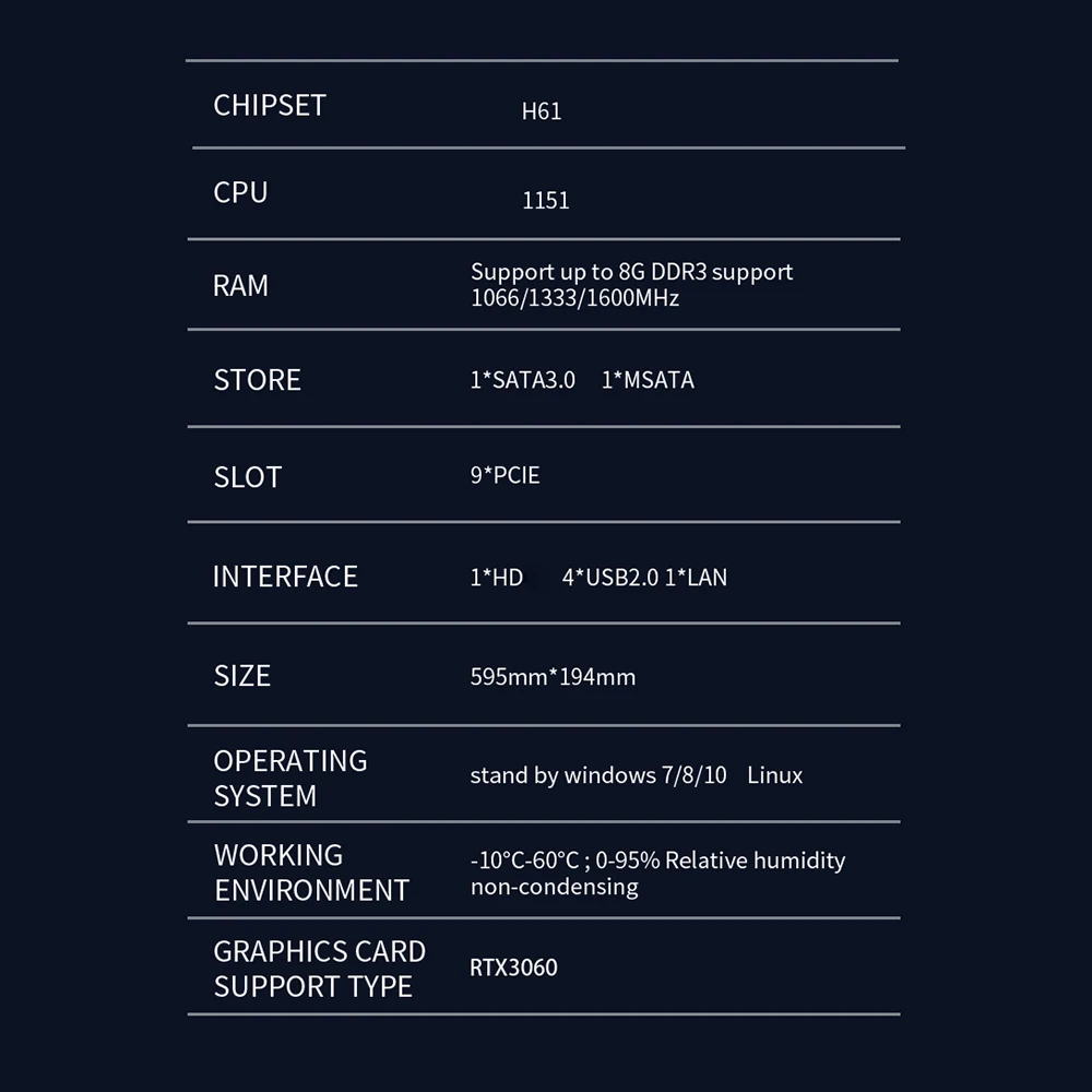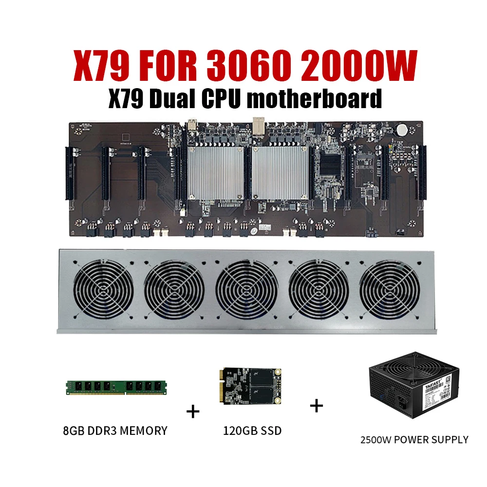 Тип 1: один 9GPU шасси без других аксессуаровТип 2: шасси 9GPU + 5 высокоскоростных вентиляторовТип 3: материнская плата X79 * 1 + процессор 2620*2 + RECC 8G * 1 + mSATA 120G * 1Тип 4:9GPU шасси + 5 высокоскоростных вентиляторов + X79 материнская плата * 1 + CPU 2620*2 + RECC 8G * 1 + mSATA 120G * 1Описание:Совместим со встроенными/внешними едиными блоками питания.Внешний дизайн шасси прост и красив.Вентилятор продукта-это вентилятор с двумя шариками, 5200 об/мин новый мощный вентилятор.Изготовлен из качественного материала, передовой технологии для создания, при складывании руки не повредит, не нужно беспокоиться о деформации.Включая:1 * интегрированная материнская плата X791 * X79 специальное шасси1 * DDR3 8 Гб памяти1 * MSATA 120GB жесткий диск1*2000 Вт источник питанияВентилятор охлаждения 4*12 см 5200 об/минХарактеристики:Наименование товара: интегрированная материнская плата GPUЦвет: серебристыйПлатформа: X79-3060 платформаПамять Дополнительно: ноутбук DDR3 8 ГбМатеринская плата + ЦП: X79 материнская плата интегрированный двойной ЦПСпециальное шасси: X79Жесткий диск: mSATA 120 ГБИсточник питания: 2000 ВтСварочный вентилятор: 4 12 см 5200 оборотовЩипцы PCIe: 10Количество: 1 комплектПримечание:-Возможны отклонения в размере от 1 до 3 см при ручном измерении.-Отклонение цвета может отличаться из-за различных настроек монитора, пожалуйста, поймите.